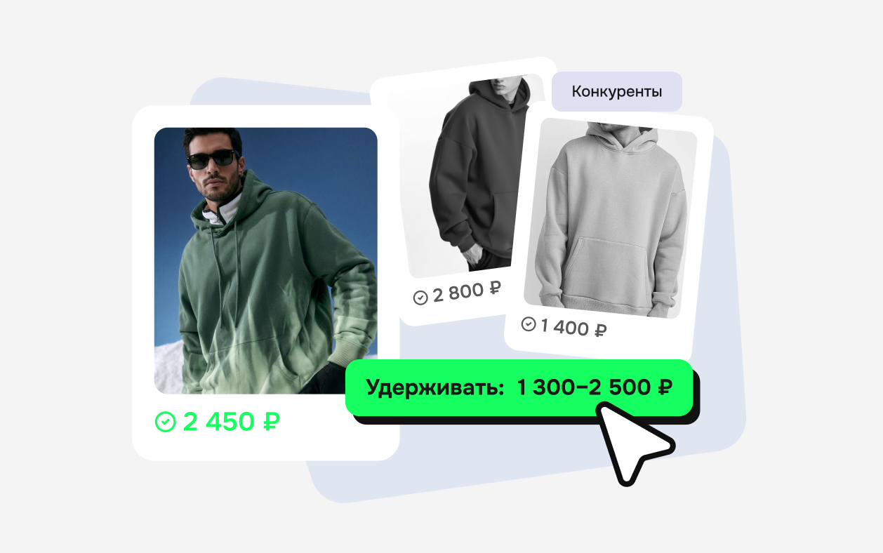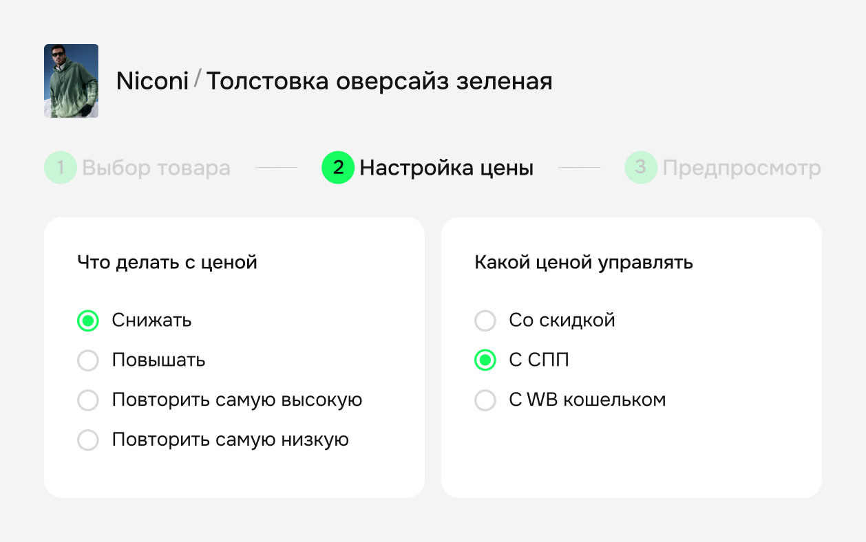 Вы добавляете до 10 товаров конкурентов и выбираете поведение: снижать цену, повышать, повторять самую высокую или самую низкую цену конкурентов. Можете задать шаг изменения цены (в рублях или процентах), минимальную и максимальную цену и порог остатка, ниже которого конкуренты игнорируются