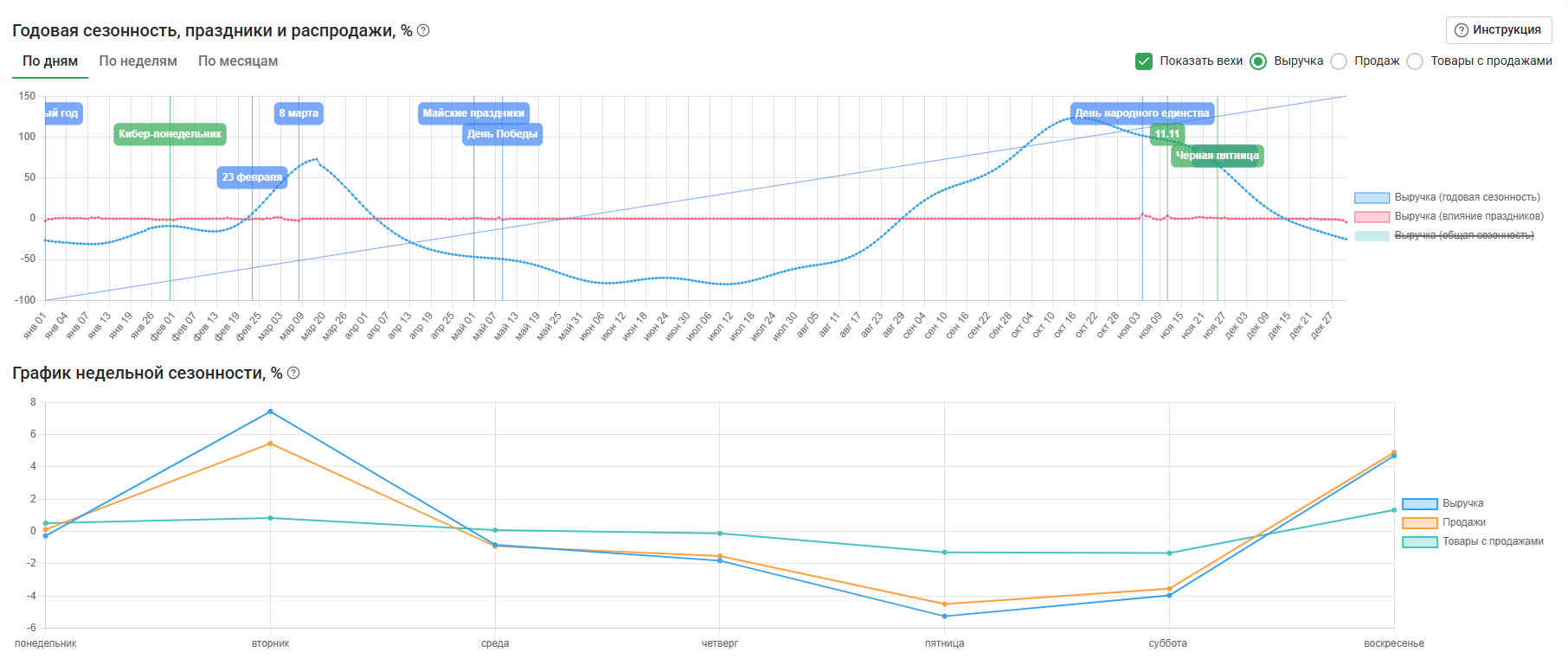 Например, на маркетплейсах существует недельный спрос и спрос по часам. То есть в определенный день недели или время суток какой-либо товар пользуется большим спросом, чем в остальные дни. Значит именно в этот день цену можно повысить, чтобы больше заработать, или понизить, чтобы привлечь больше внимания к карточке. В обоих случаях нужно тестировать, какая из стратегий сработает лучше.