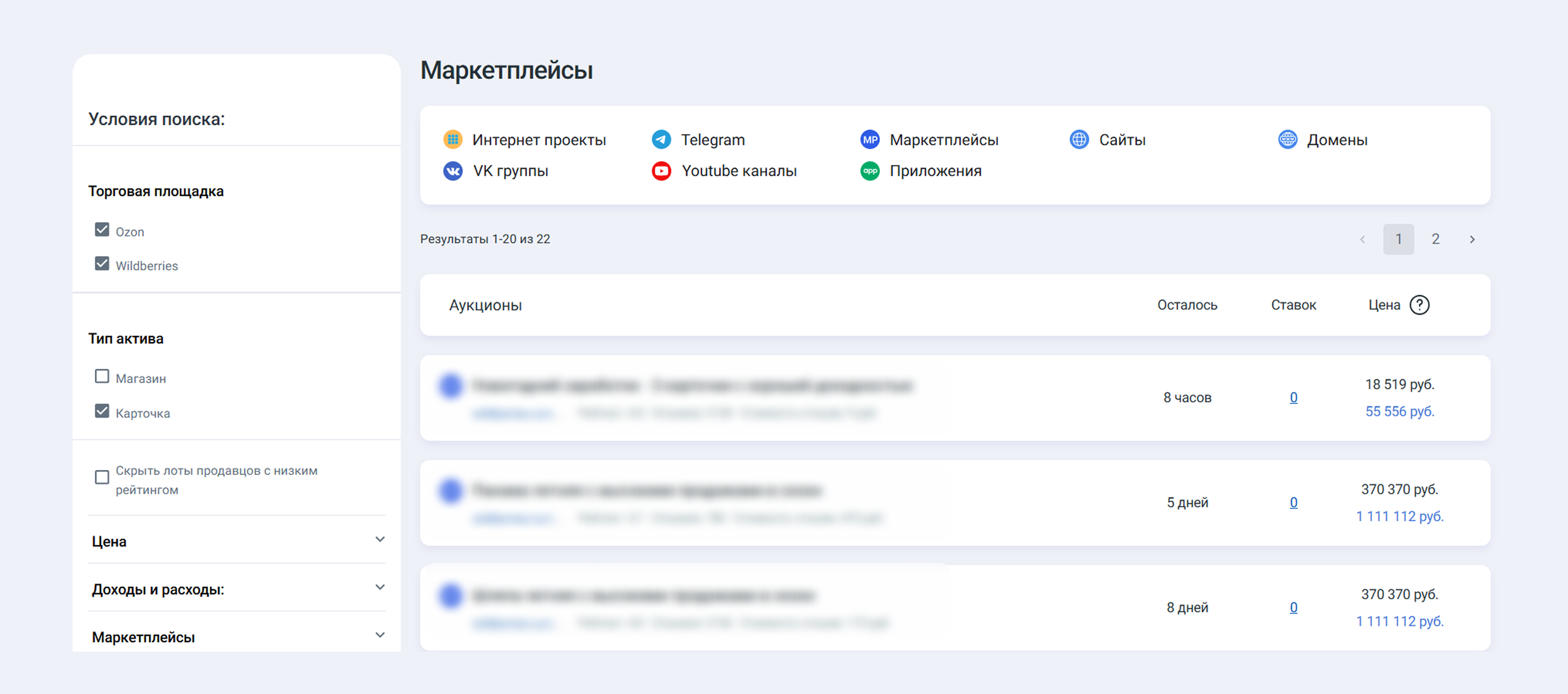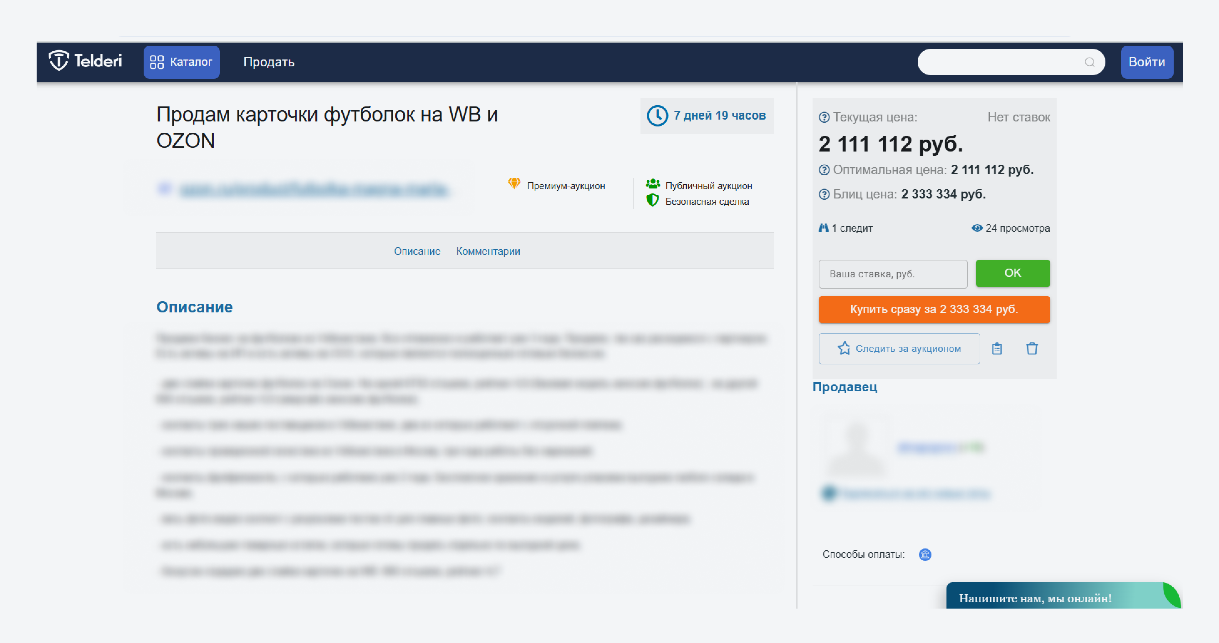 Помимо официальных сервисов маркетплейсов, существуют независимые торговые площадки. Одной из них является биржа Telderi. Это специализированный ресурс, на котором можно купить/продать различные цифровые активы, где в том числе есть карточки товаров с Ozon и Wildberries.