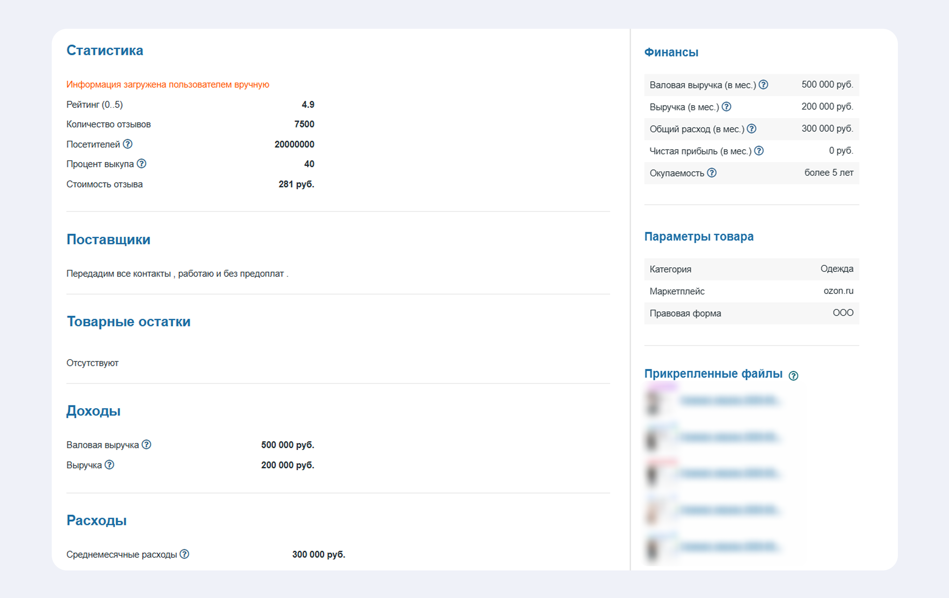 - Базовая статистика — продавцы размещают ключевые данные по карточке: ежемесячную прибыль, оборот, количество заказов, рейтинг и процент выкупа. Это помогает провести предварительный анализ.