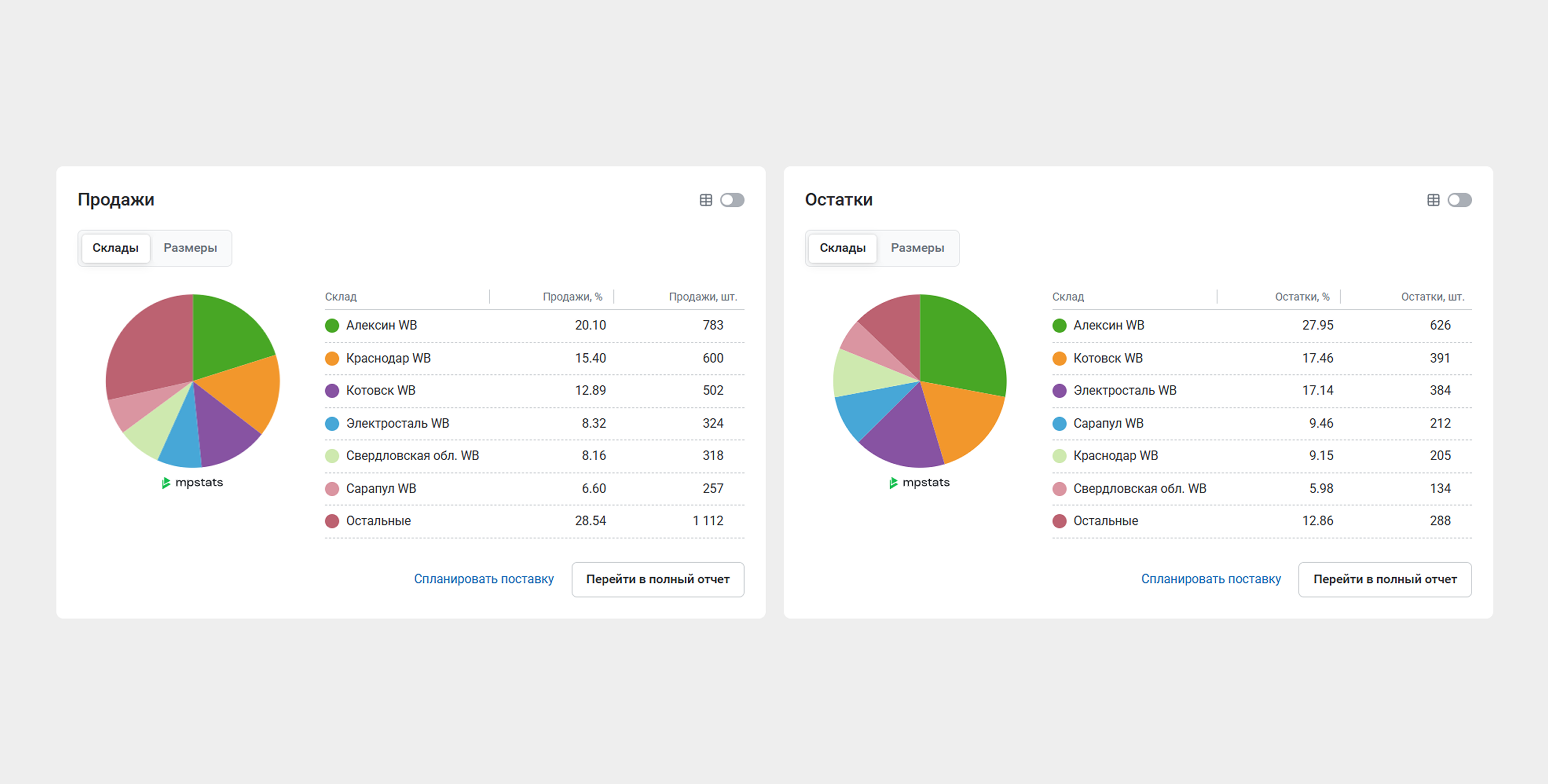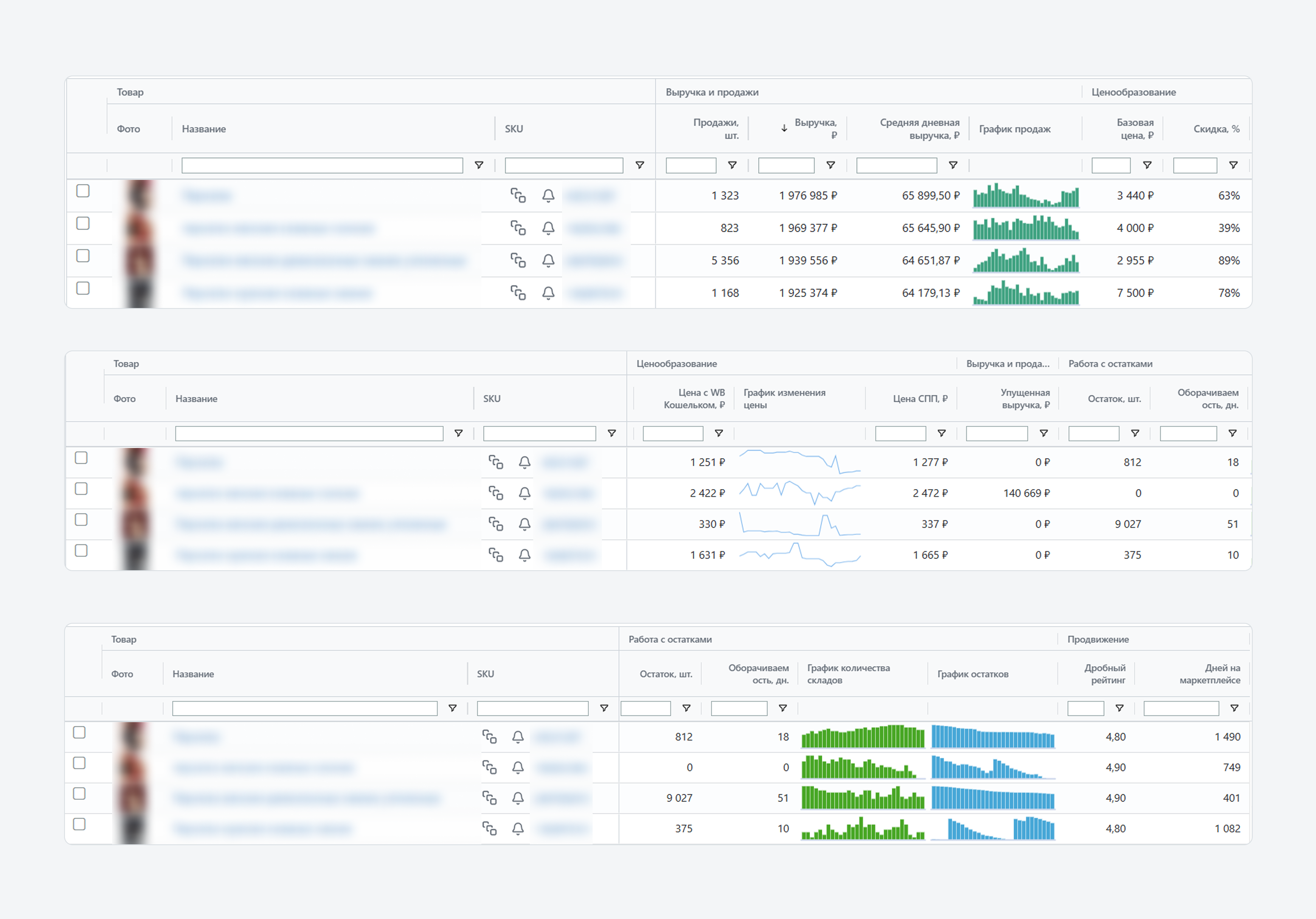- показатели продаж, % выкупа, упущенная выручка, скидки и пр.