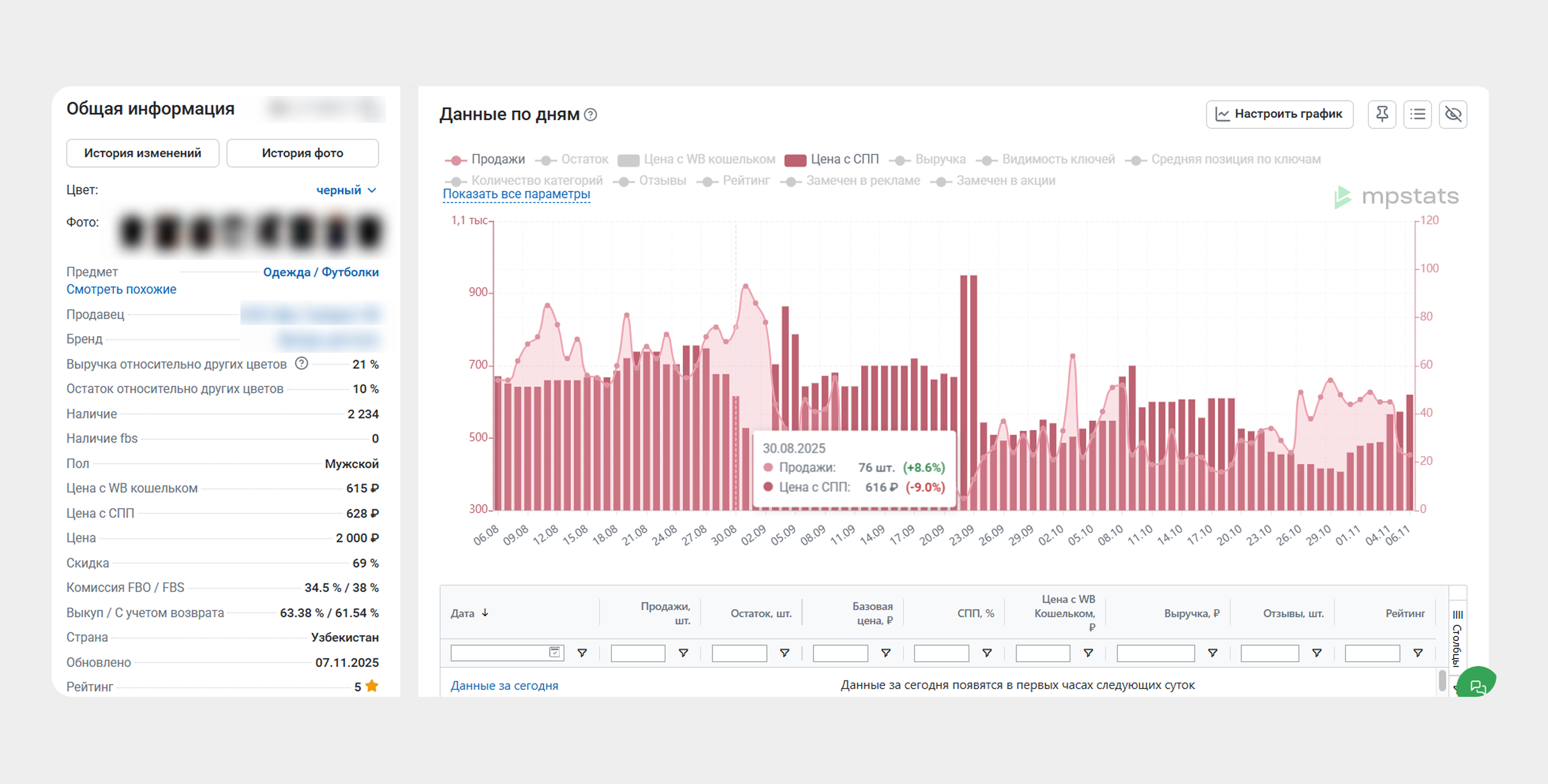 ✅ Показываем на примере. Для начала посмотрим основные метрики за определенный период, мы взяли последний месяц. Здесь выручка, продажи в динамике, цена и график ее изменения, скидки, оборачиваемость, рейтинг и пр.