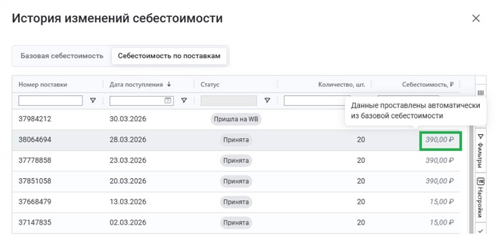 Как стало. Теперь базовая себестоимость автоматически предзаписывается в поставку. Она отображается как предзаполненное поле, но вы всегда можете отредактировать ее вручную.