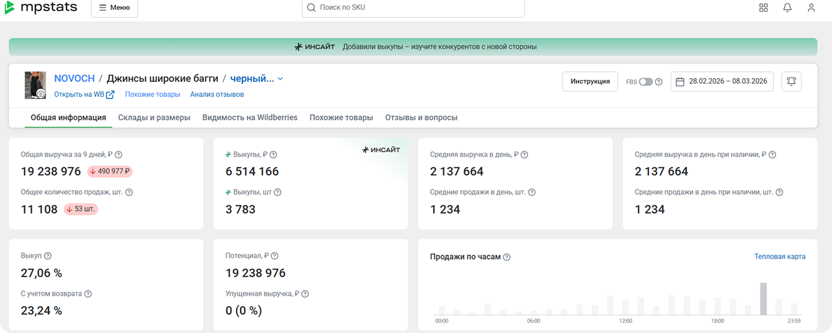 1. Разделили метрики. Ранее данные по остаткам и Инсайту смешивались в полях «Продажи» и «Выручка». Теперь Инсайт вынесен в отдельные показатели: «Выкупы, шт» и «Выкупы, руб».