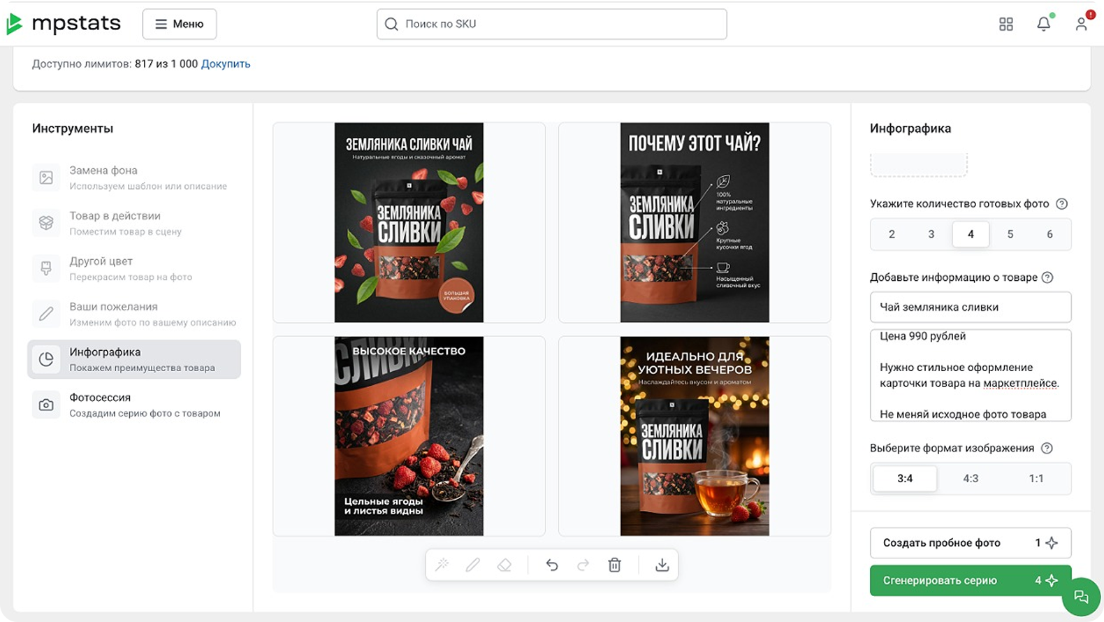 Например, если пользователь генерирует инфографику из 5 фото, то спишется 5 лимитов. За генерацию тестового фото тоже списывается лимит.