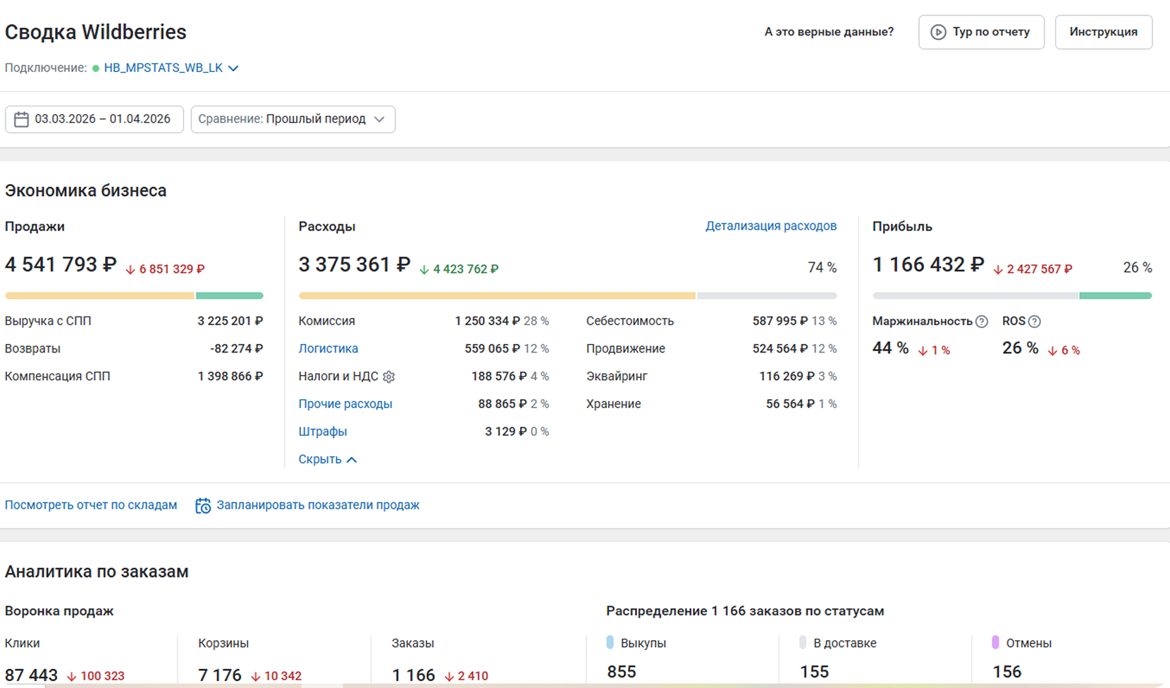 В подробном отчете по SKU можно посмотреть следующие показатели за период отчета: