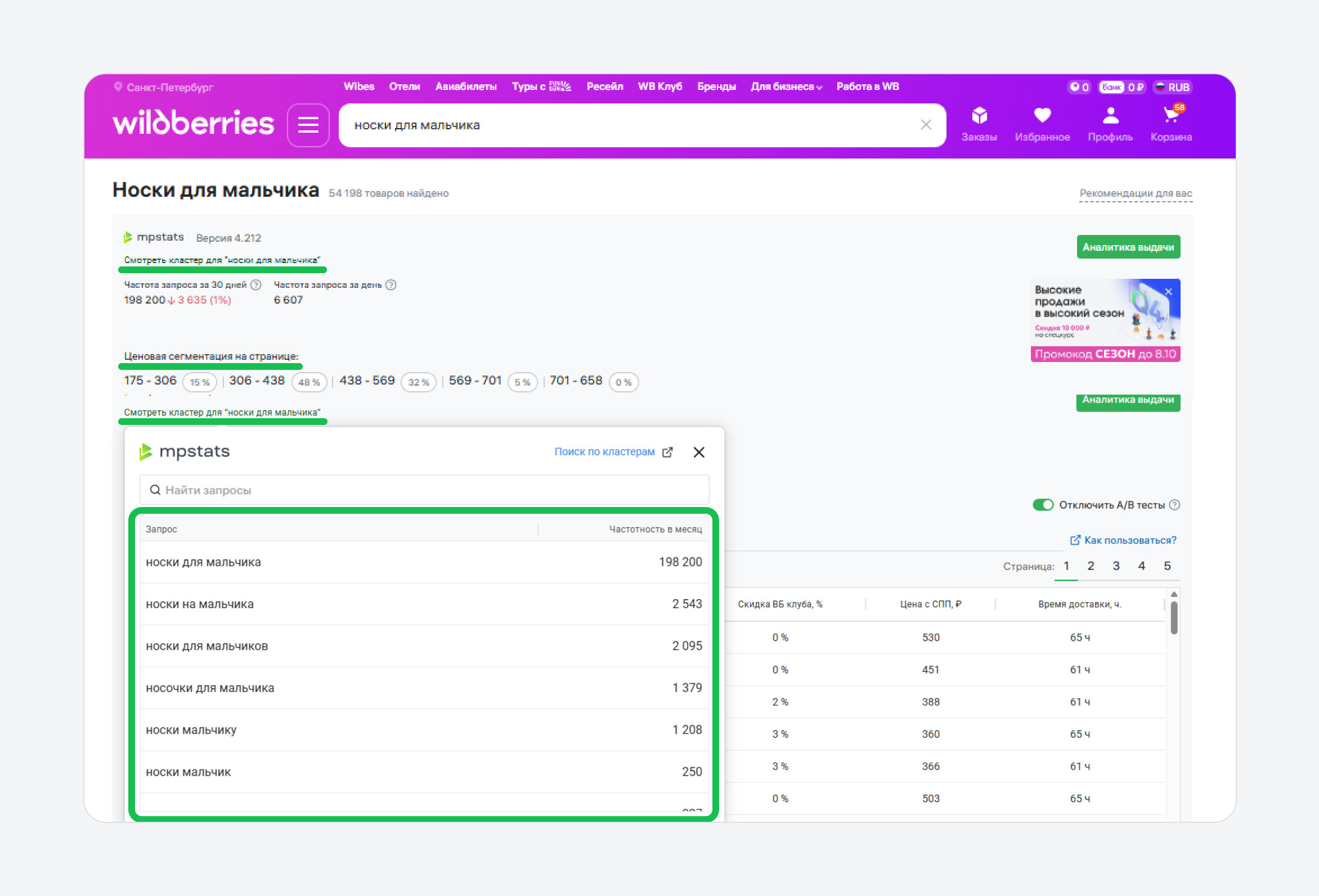 Чтобы плагин заработал, введите поисковый запрос на странице маркетплейса. Первое, что вы увидите — общая сводка. Указали частоту запроса и ценовые диапазоны среди товаров на странице. Здесь же указано, к какому кластеру относится поисковая фраза.