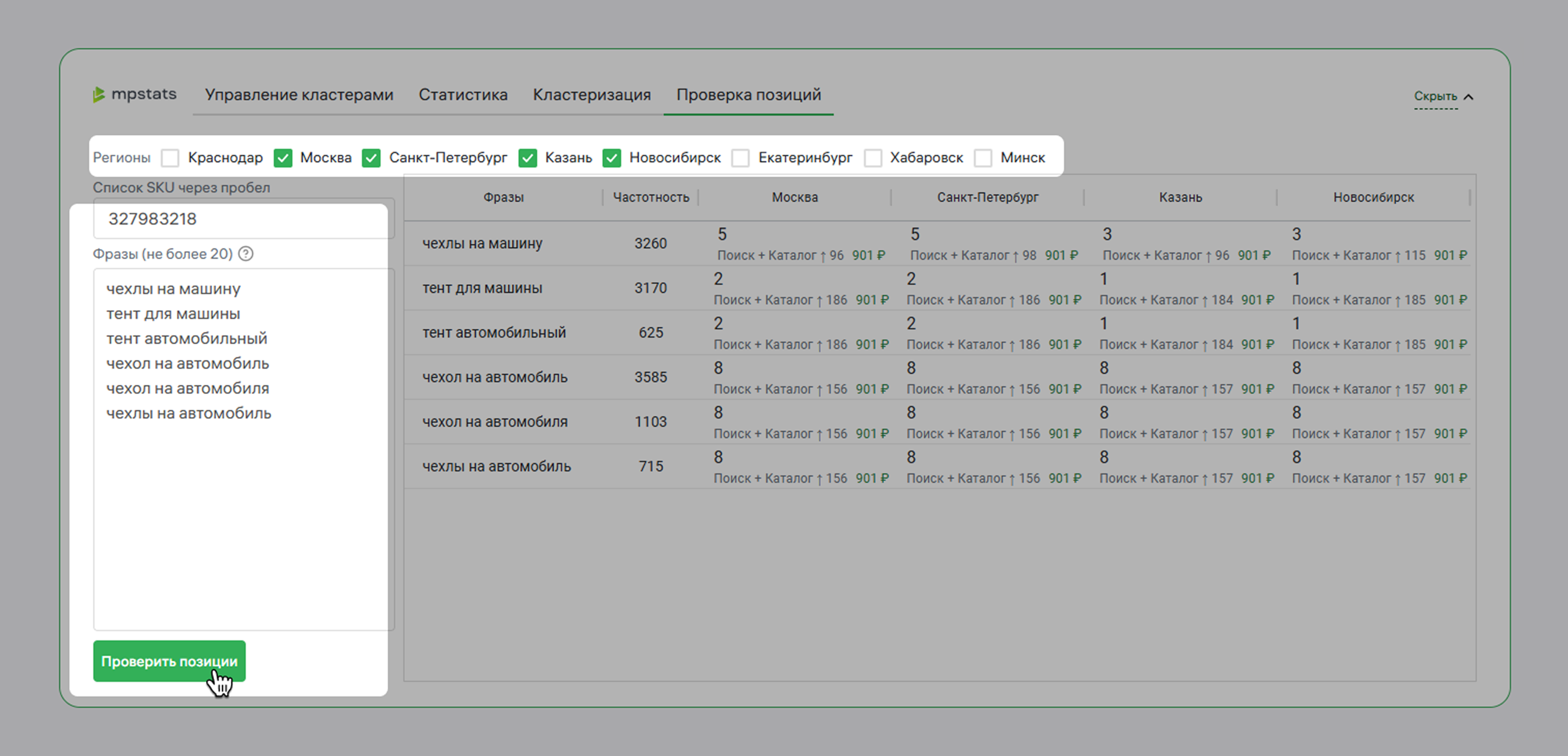 - Проверить позиции по запросам. Просто введите 20 фраз и укажите регион.