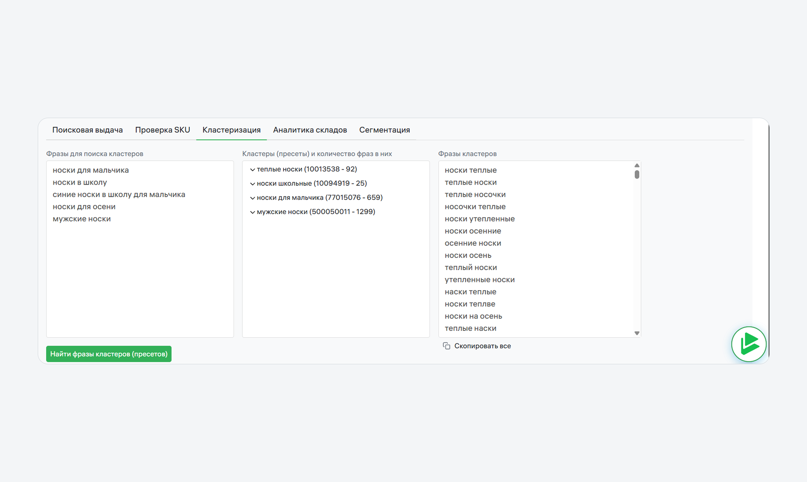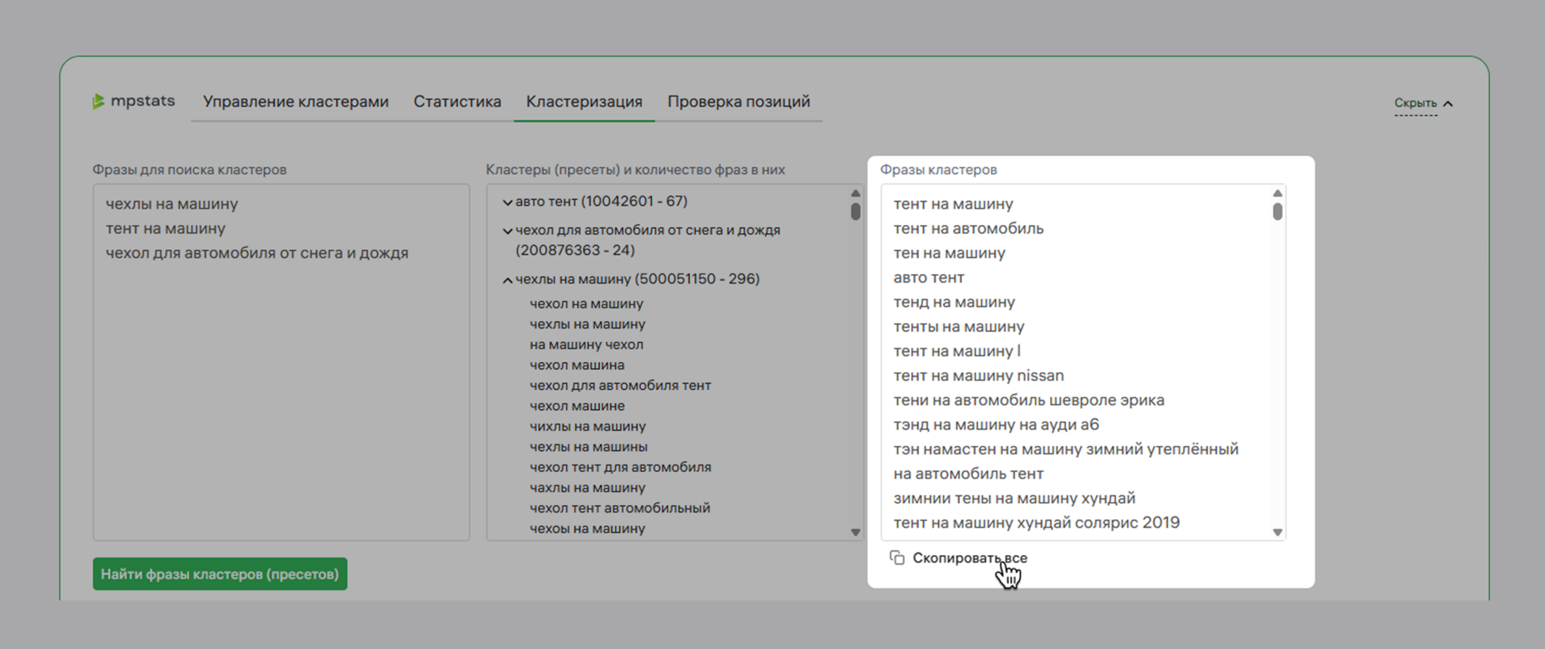 - Кластеризация. Введите до 20 интересующих фраз, чтобы узнать, к каким кластерам и пресетам они относятся, и получить до 500 самых высокочастотных запросов в них