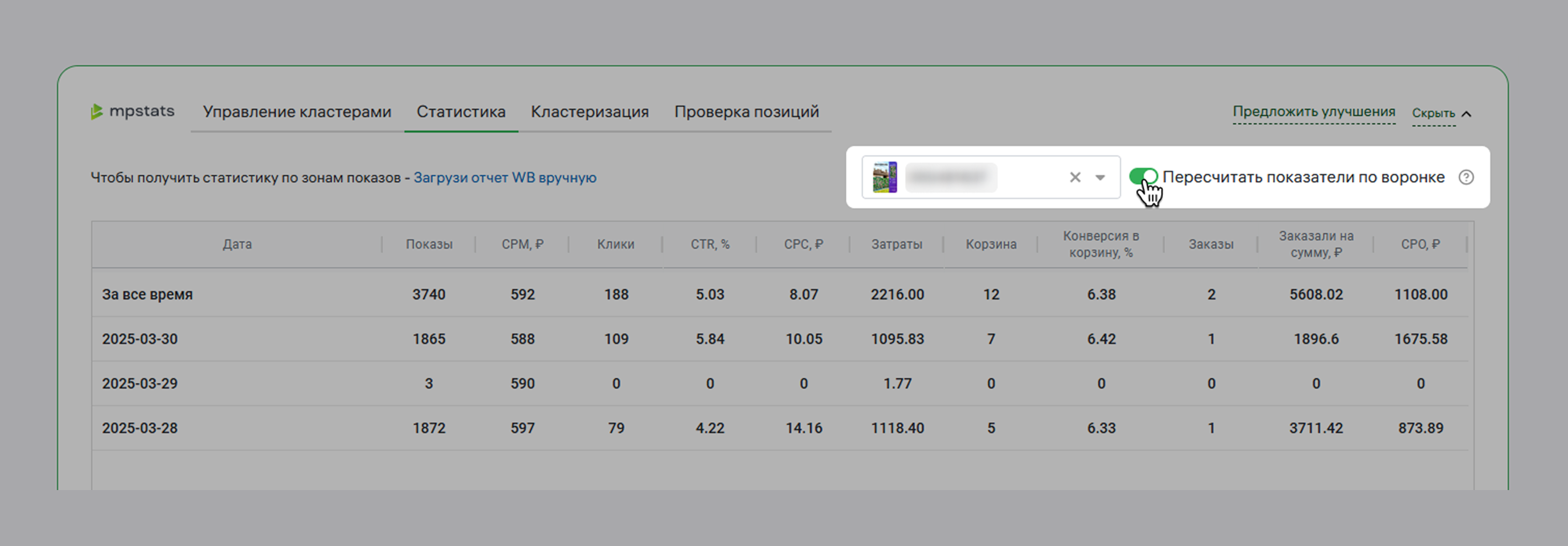 - Изучить статистику рекламной кампании по дням. Узнаете количество показов, ставки, CTR, затраты, продажи и пр. Идеально для оценки воронки продаж и эффективности РК.