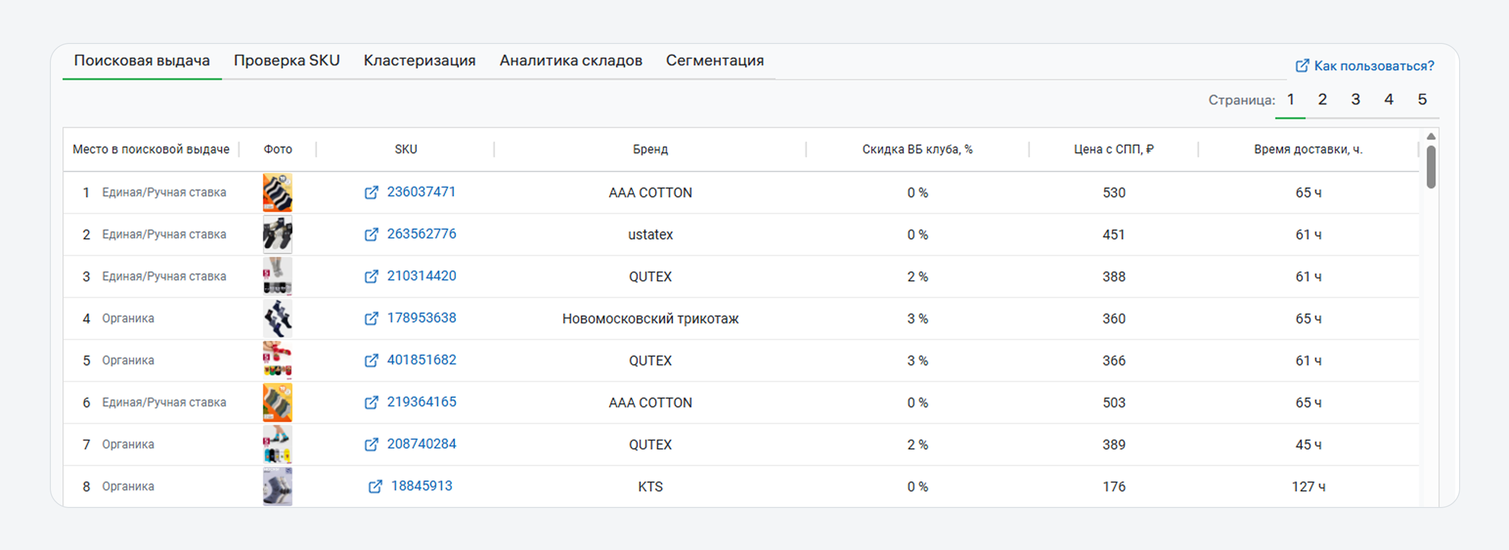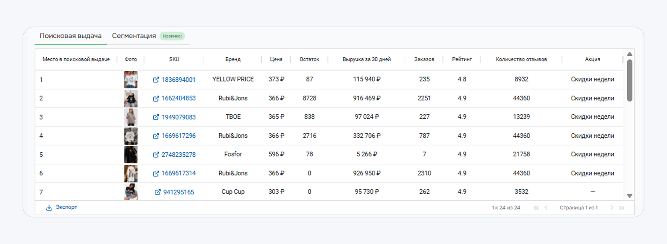- место в выдаче, фото, SKU и бренд
