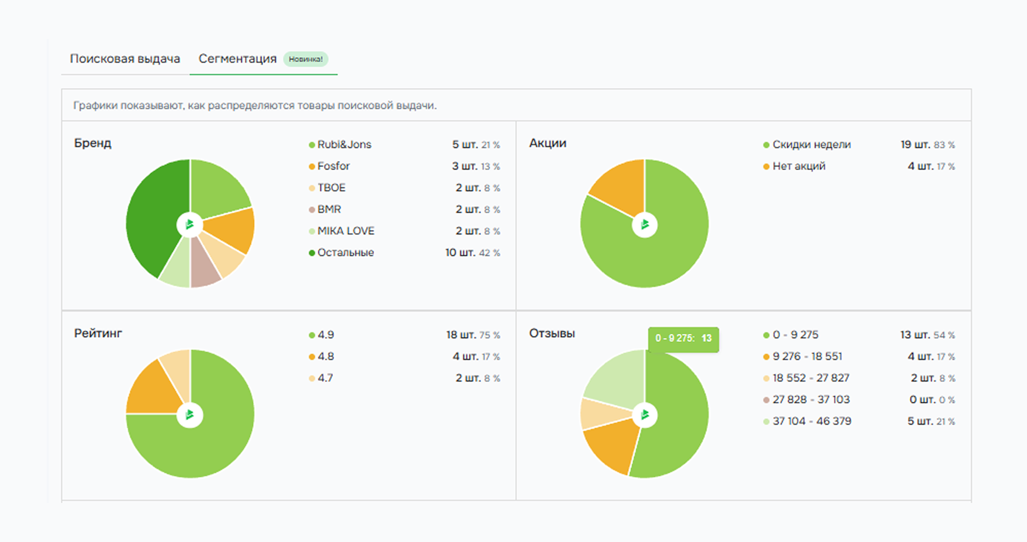 Если нажать на вкладку «Сегментация», то попадете в раздел с диаграммами. Они покажут сводку по топ-100 товарам из выдачи. Тут карточки распределяются по: