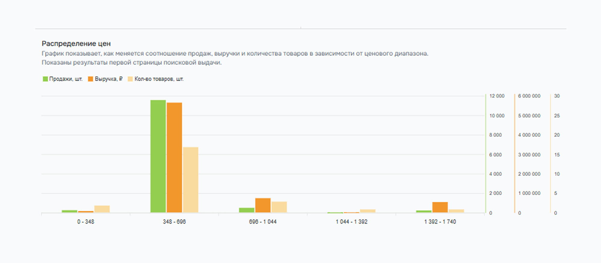 Ниже есть график, который показывает соотношение продаж, выручки и количества товаров в зависимости от ценового диапазона.
