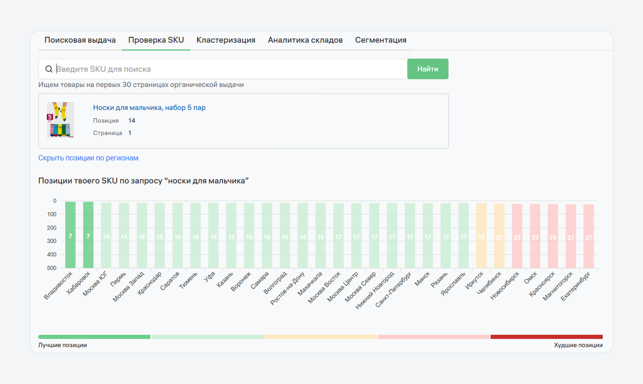- Проверка SKU. Поиск определенного товара на первых 30 страницах выдачи в разных регионах.