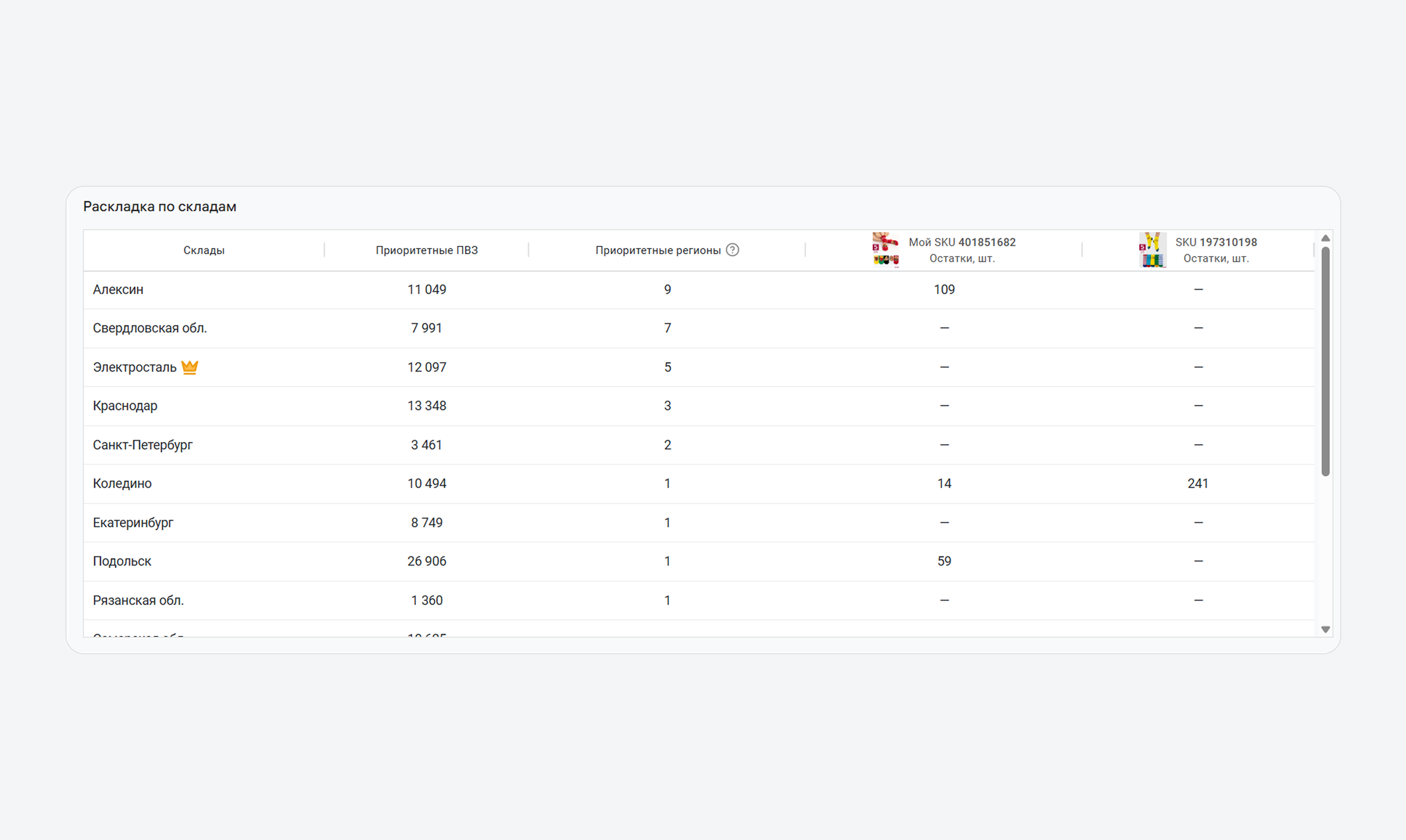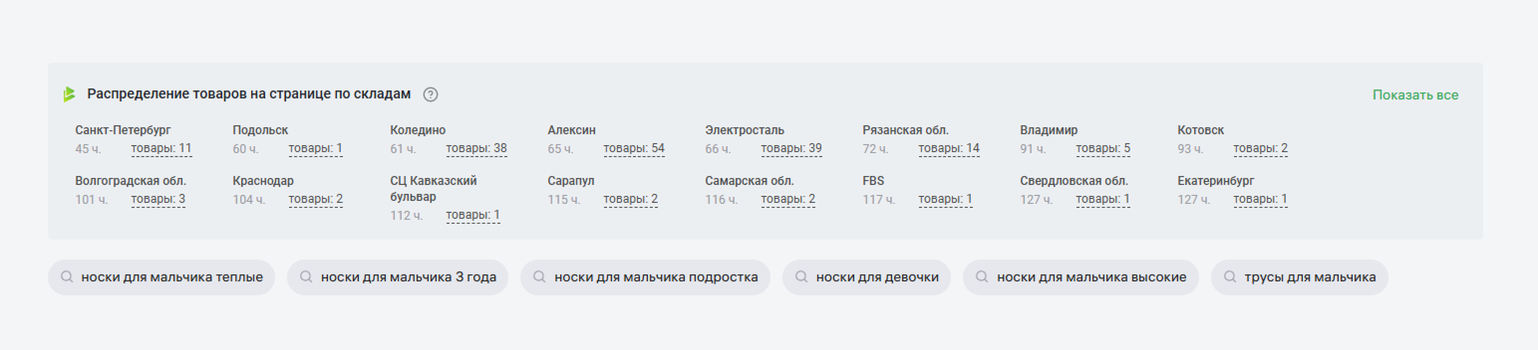 В этом разделе показаны все склады маркетплейса, на которых есть товары из выдачи. Причем они расположены в определенном порядке: по времени доставки до ПВЗ, с которого просматривается выдача. Если вы нажмете на количество товаров, то откроется список SKU, которые есть на этих складах.