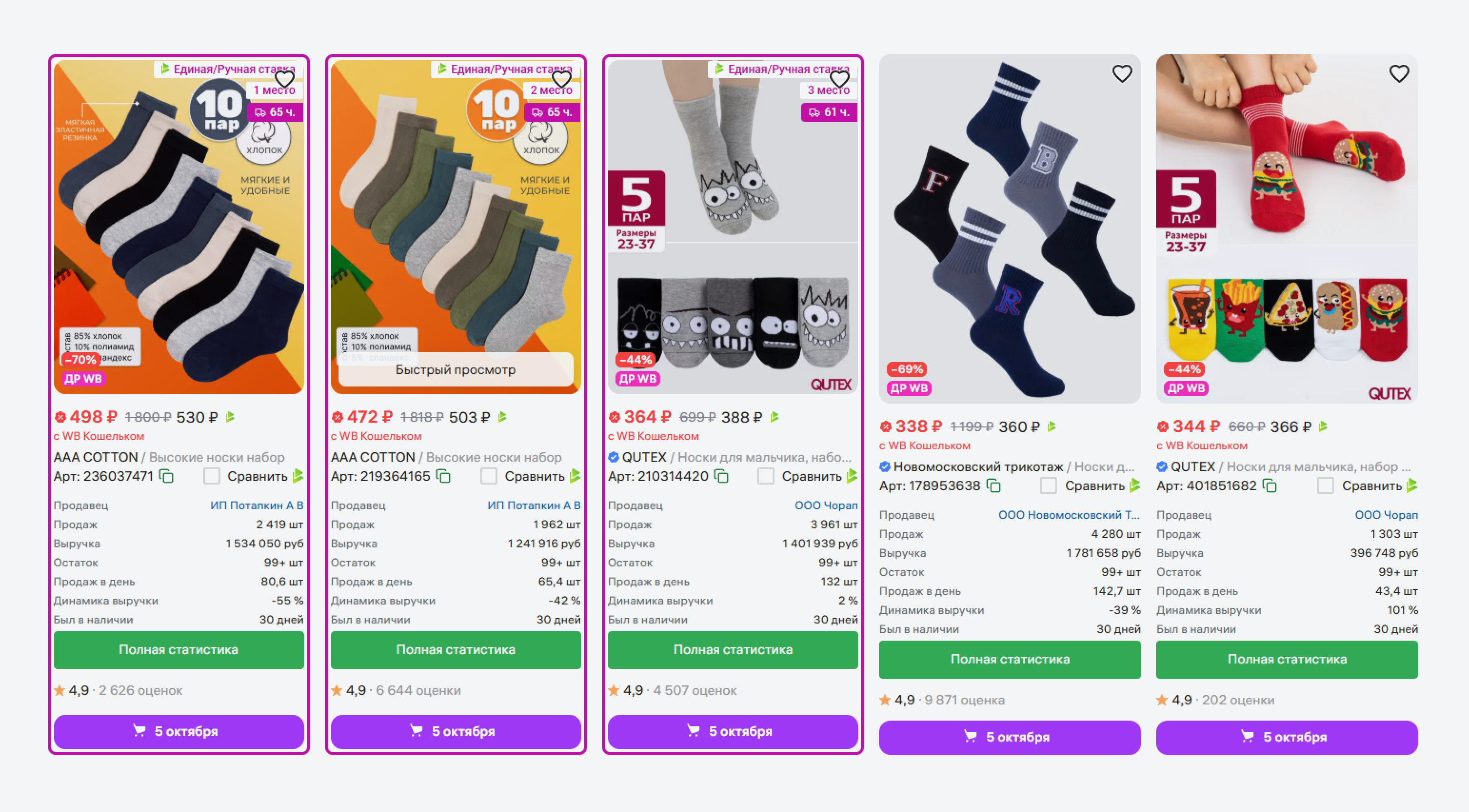 С помощью расширения вы увидите, какие карточки попали в выдачу органически, а какие — с помощью рекламы. Система пометит фиолетовой рамкой рекламные позиции и укажет к ним срок доставки.
