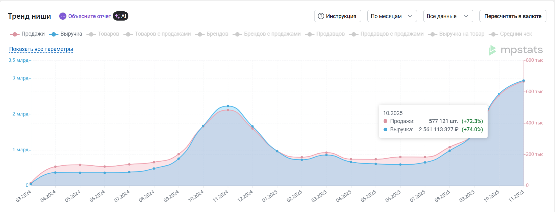Чтобы определить сезонность товара, посмотрите на динамику продаж и выручки от месяца к месяцу за последний год. На нашей платформе такой отчет называется «Тренд» и находится в инструменте «Выбор ниши».