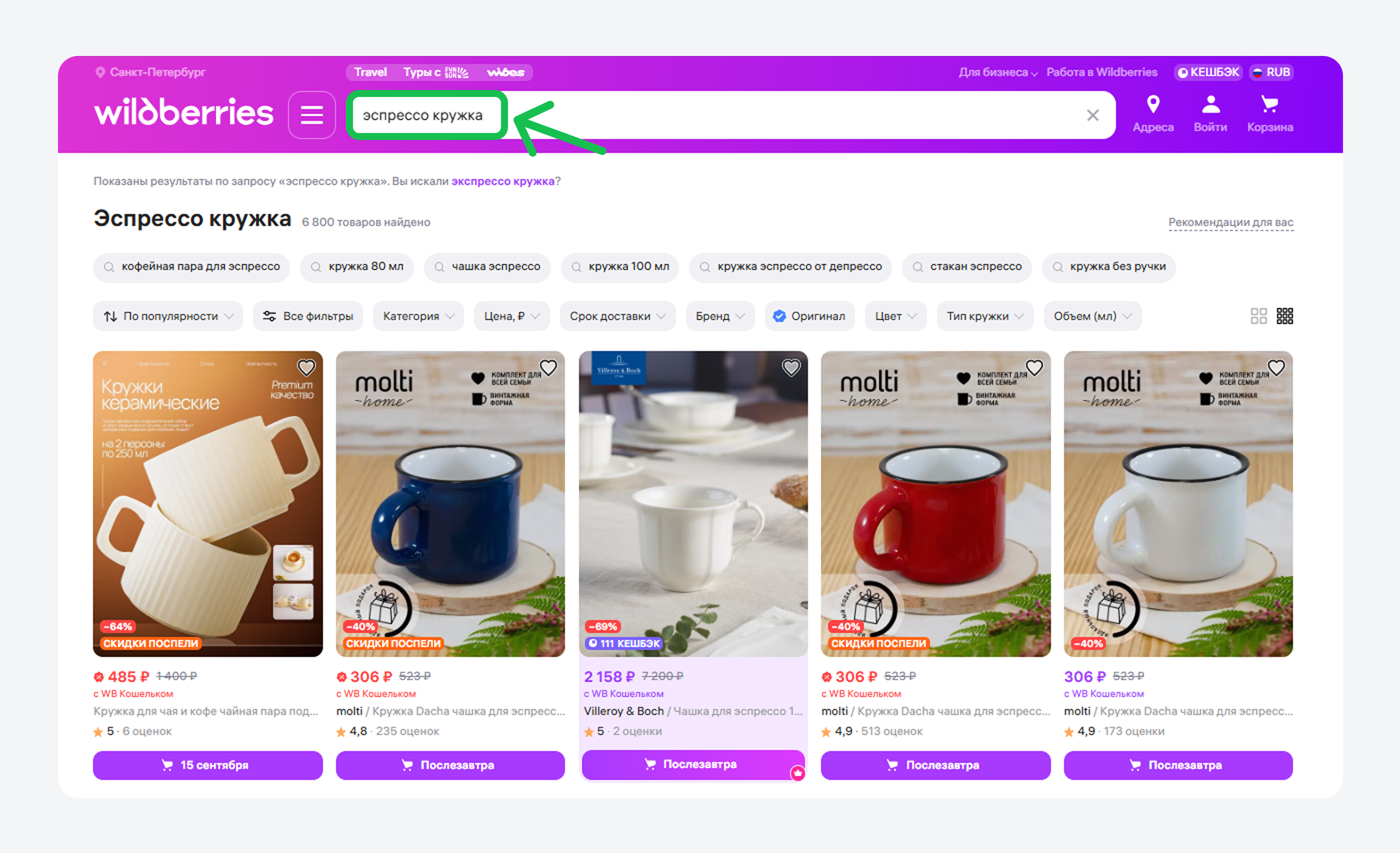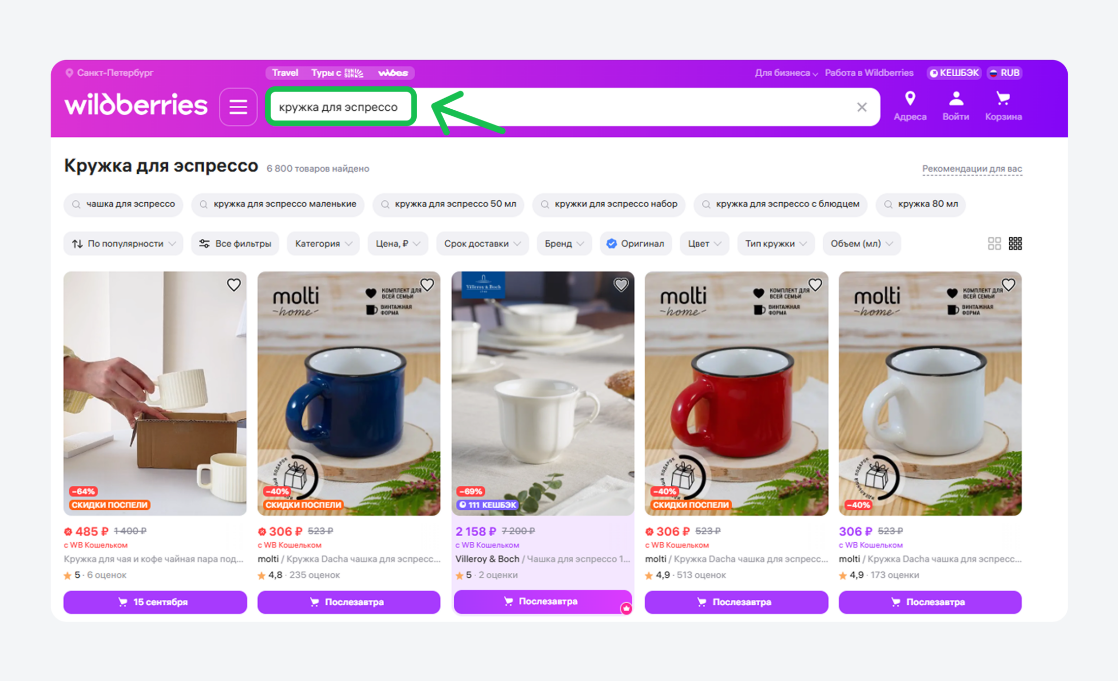 По запросам кластера отображаются одни и те же товары. То есть по запросам «кружка для эспрессо» и «эспрессо кружка» пользователи получат одинаковую поисковую выдачу.