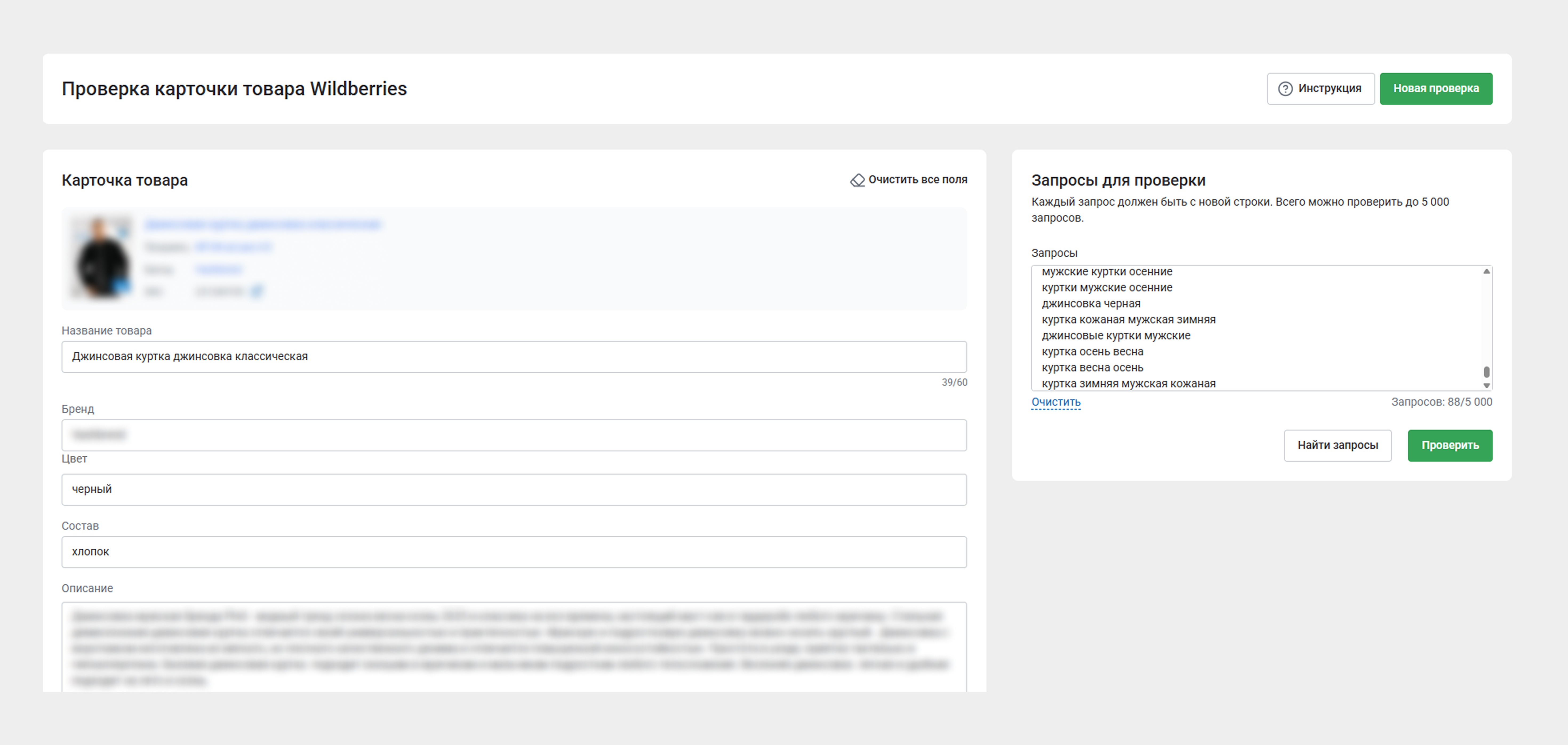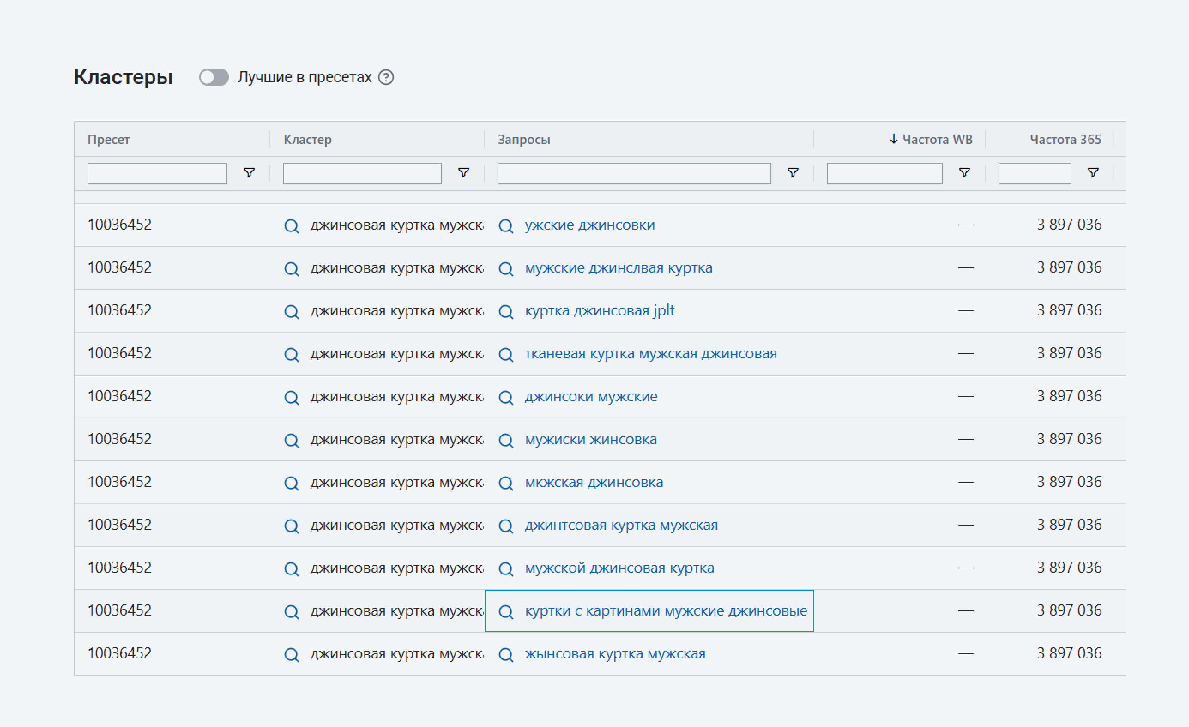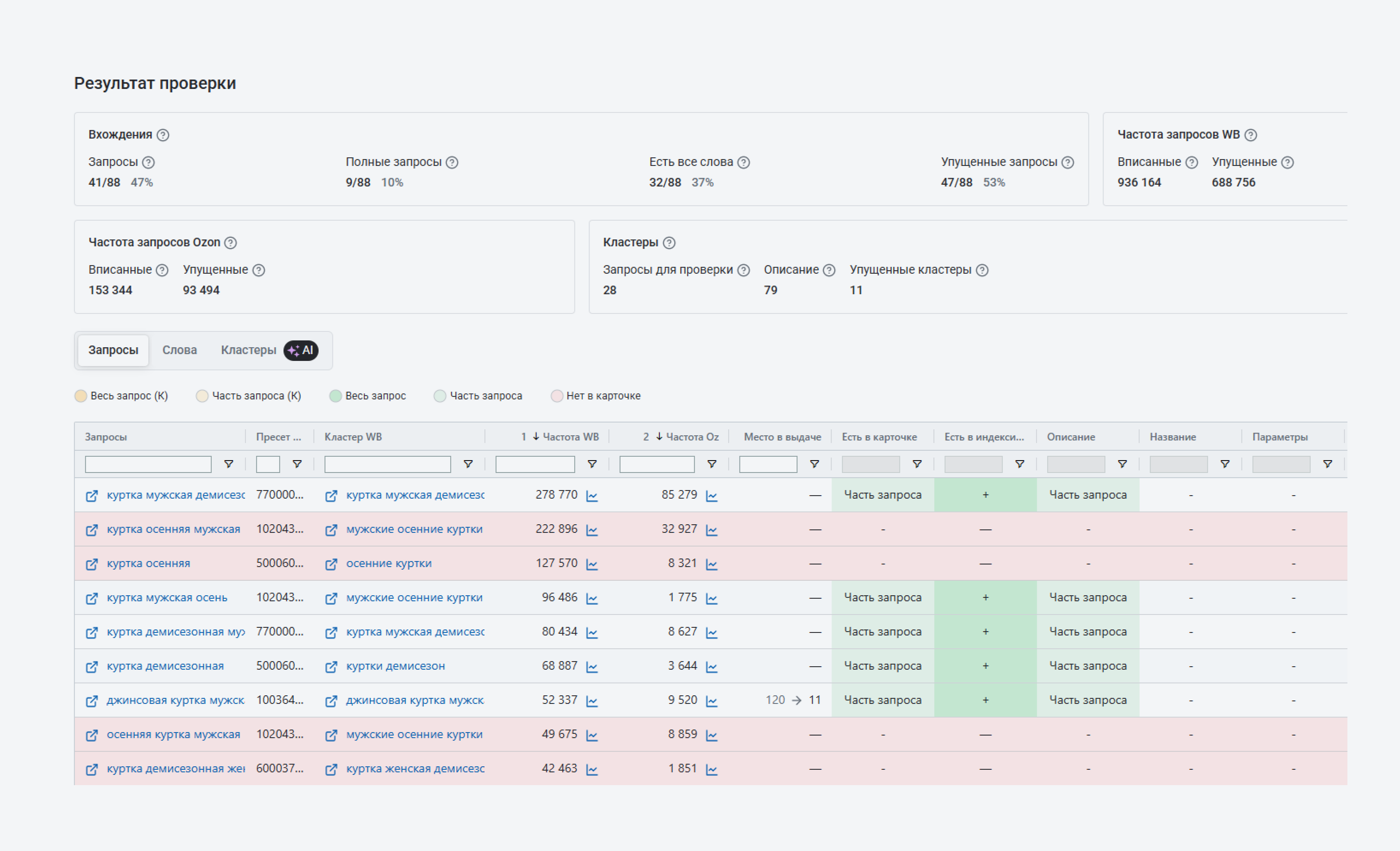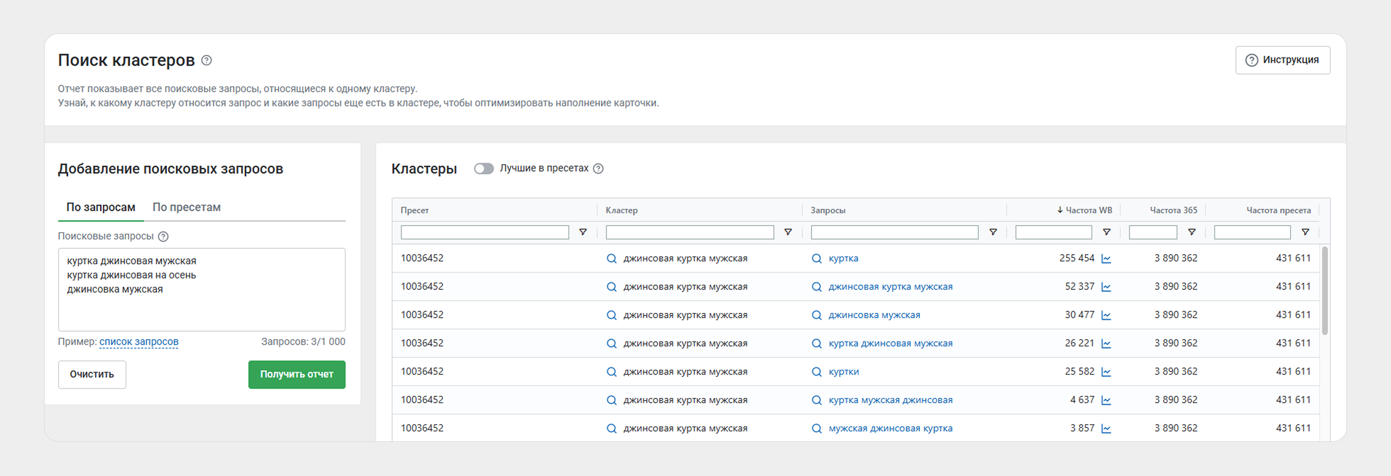 Здесь вы узнаете, к каким кластерам и пресетам относятся запросы для вашей карточки товара. Введите их в специальное поле, и смотрите отчет по всем кластерам и их составу. Это поможет оптимизировать текст описания и сделать его лаконичнее.