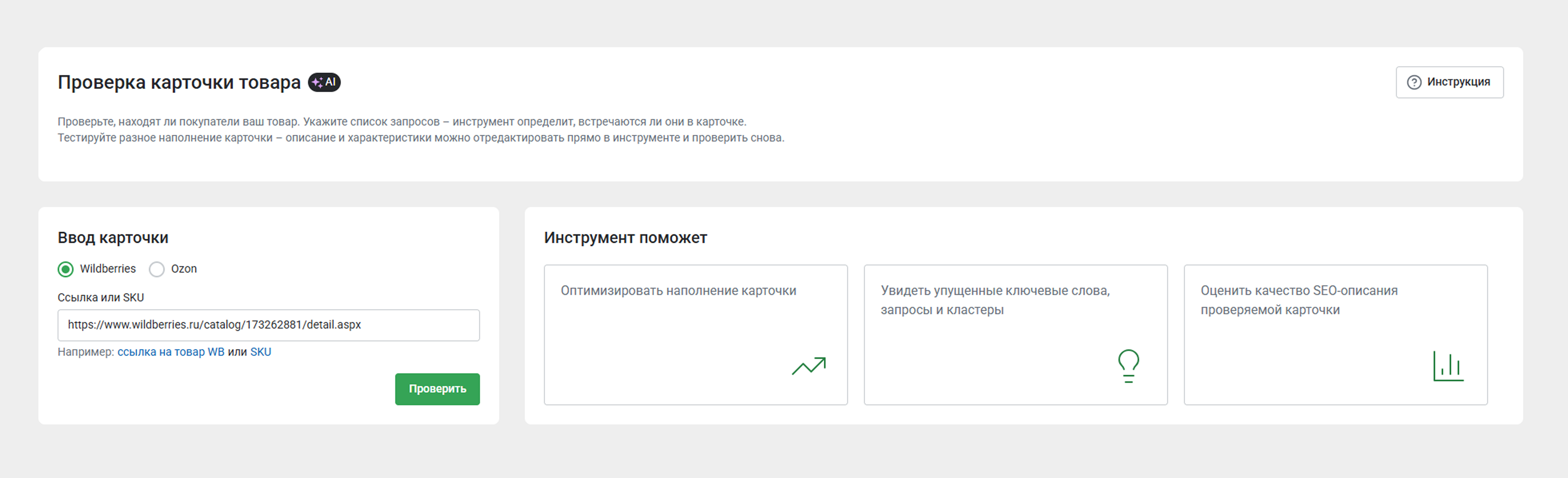1. Введите ссылку на ваш товар или его SKU в специальное поле и нажмите «Проверить».