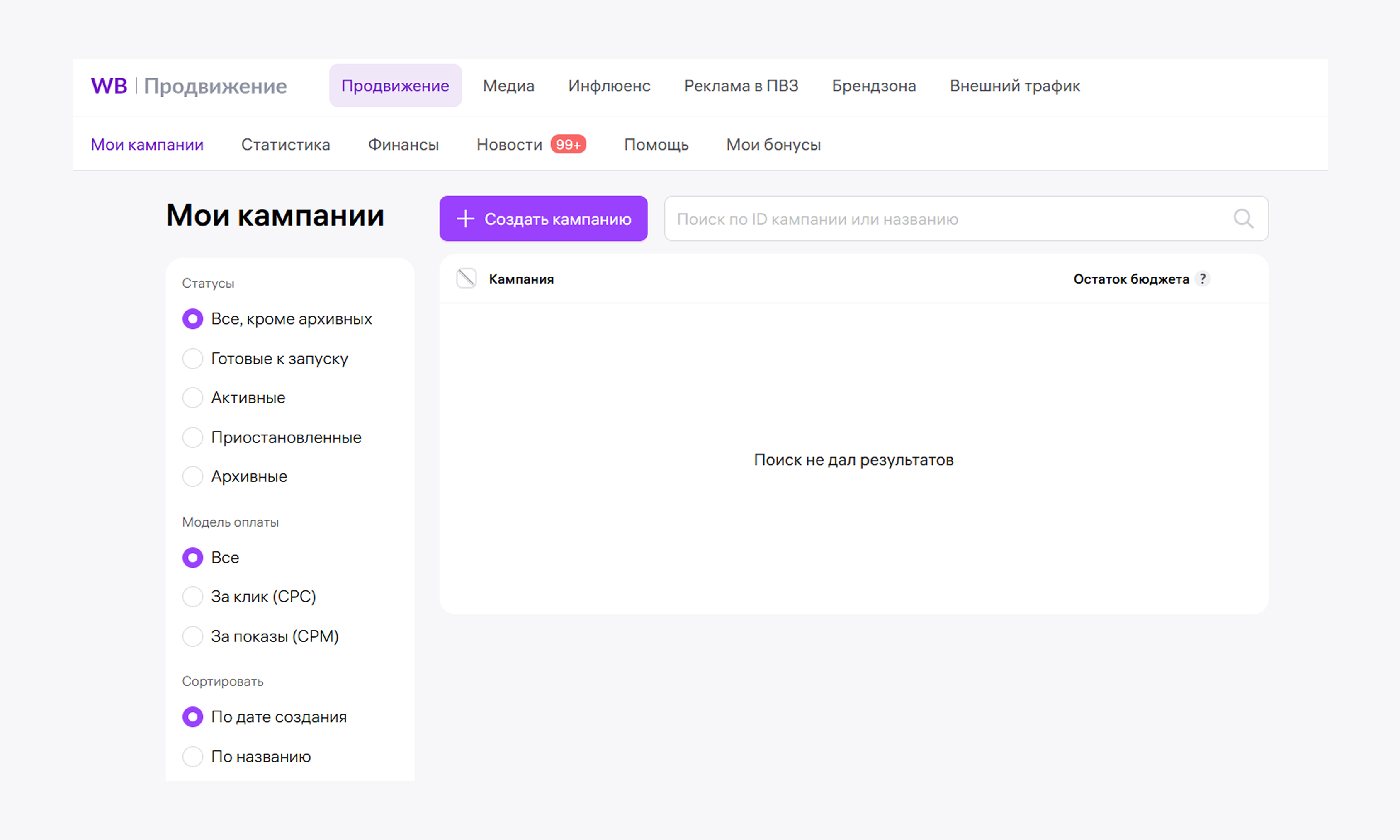 1. Создаем компанию в кабинете «ВБ. Продвижение». Называем ее и указываем бюджет, который готовы потратить.