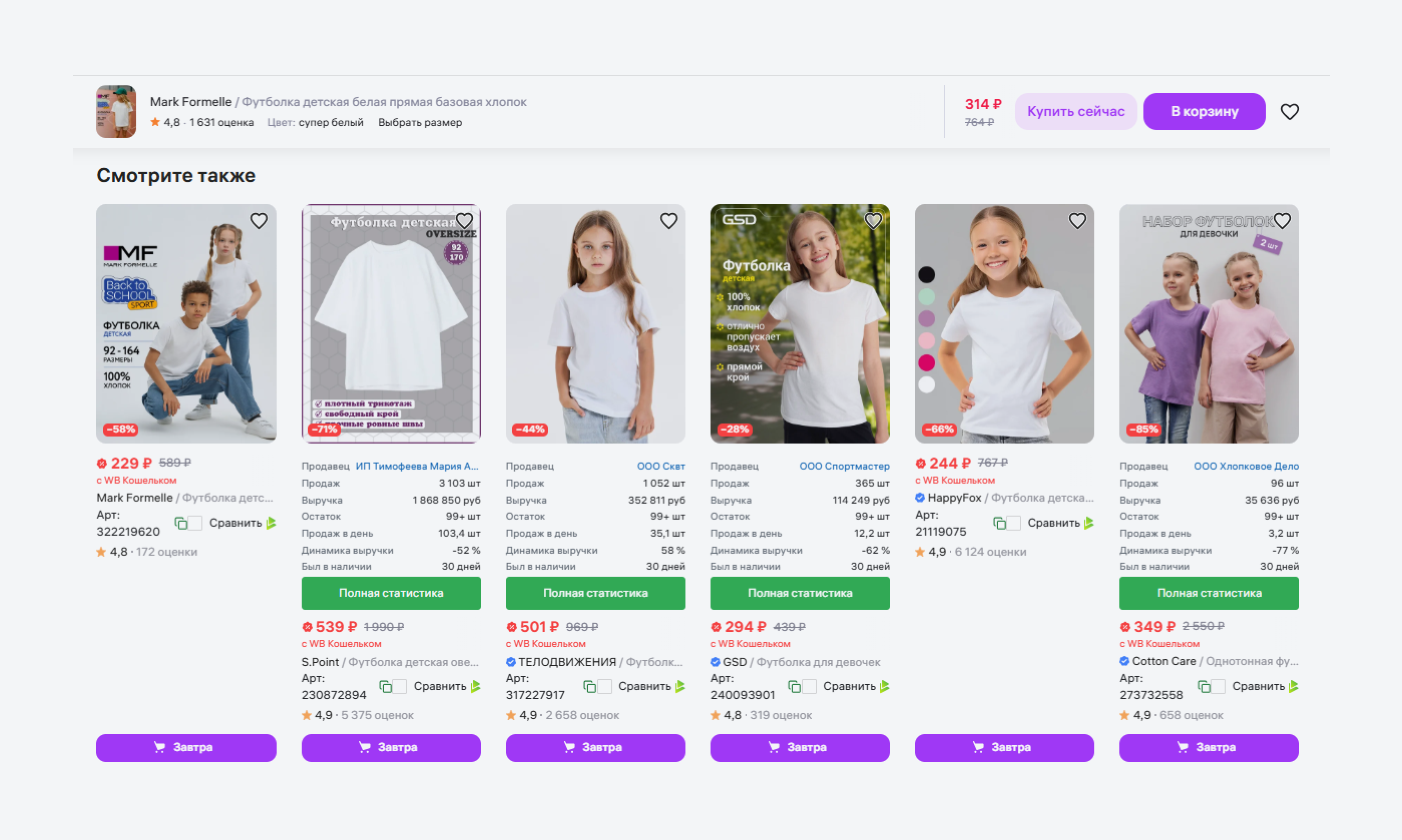 - Внешний вид товара на фотографии. Допустим, покупатель зашел в карточку «Футболка оверсайз для девочки белая» — внизу, в первую очередь, он увидит предложения с похожим визуалом.
