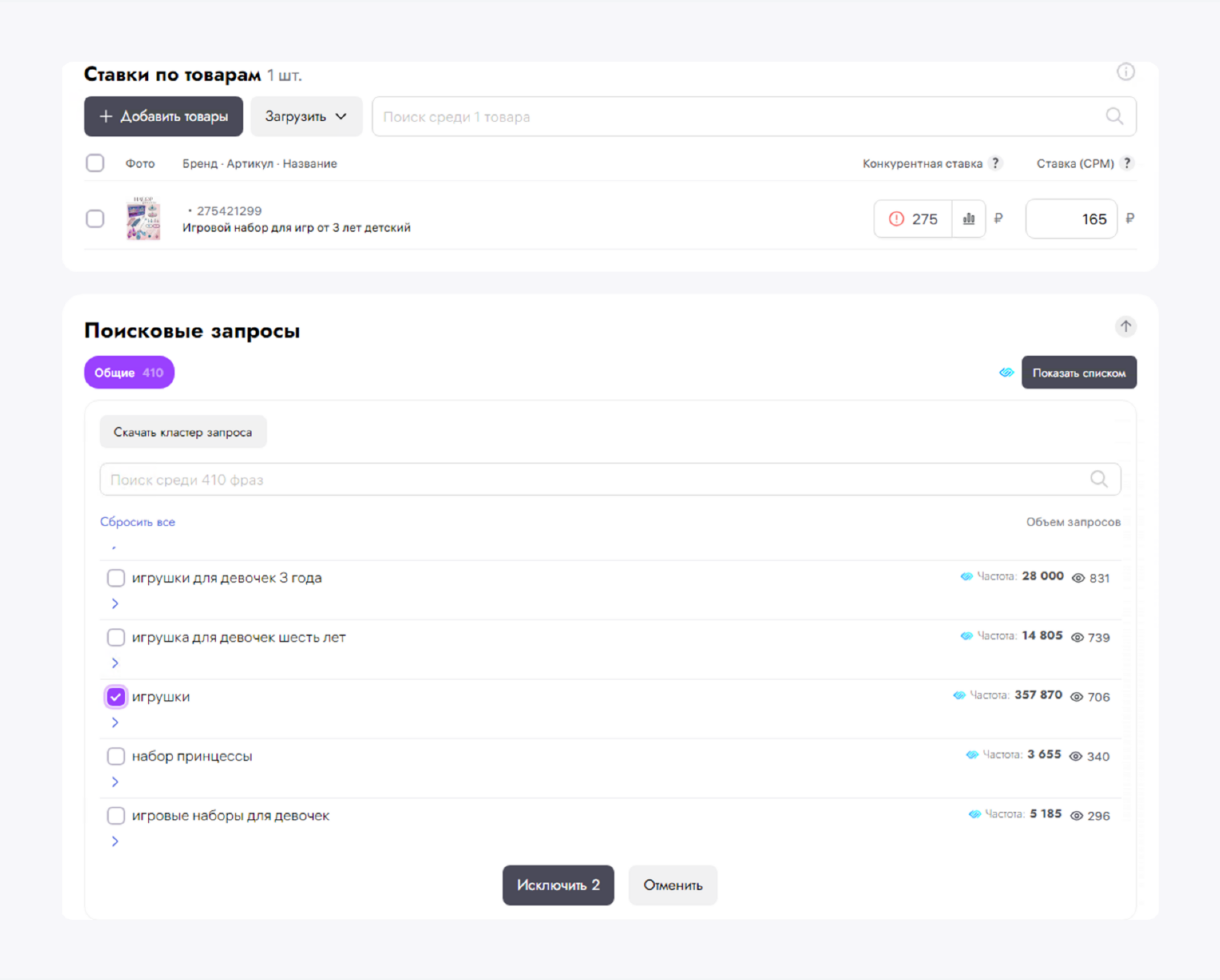 1. Точечное управление и автоматизация. Здесь гораздо проще работать с поисковыми фразами — в помощь искусственный интеллект и умные алгоритмы. Например, вам не нужно вручную минусовать все фразы, которые предложит WB. Достаточно выбрать лишь те, по которым хотите оставить показы. Еще он сможет самостоятельно минусовать фразы — например те, у которых низкая кликабельность.