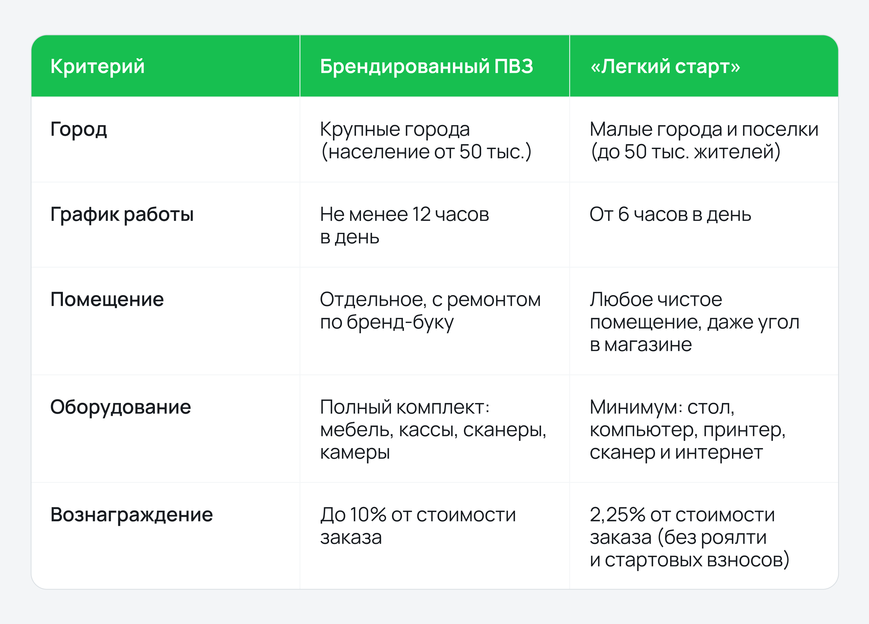 - Брендированный пункт — это полноценный бизнес с высоким доходом. Он требует серьезных вложений в ремонт и оборудование, но окупается за счет большого потока заказов и высокого процента вознаграждения. Этот вариант подойдет тем, кто готов инвестировать от 300 000 ₽ и искать помещение в проходимом месте.