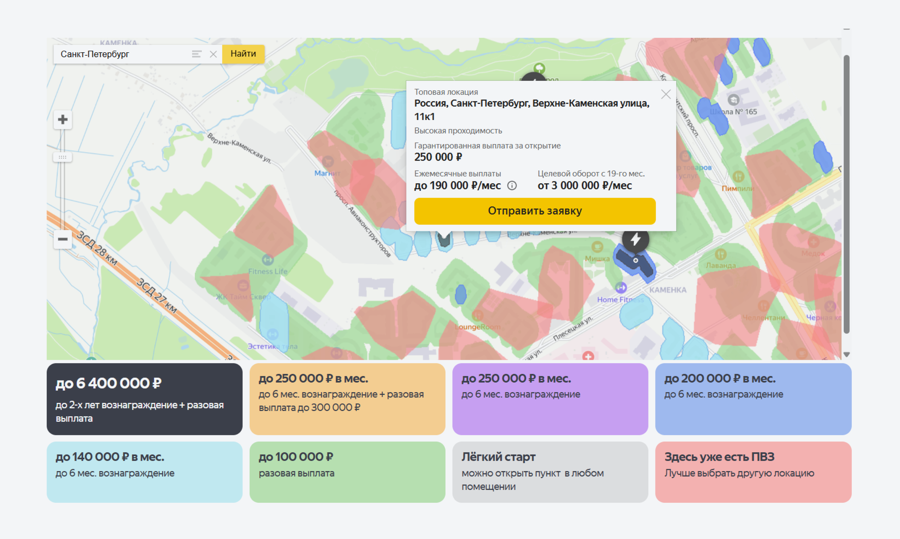 Правильный выбор места — основа успеха вашего будущего бизнеса. Чтобы помочь партнерам, Яндекс Маркет разработал специальную карту с рекомендованными локациями. На ней цветом отмечены зоны, где пункты выдачи особенно нужны.