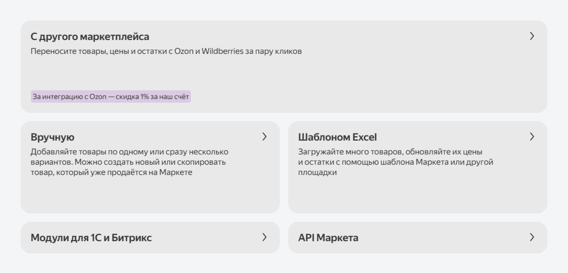 На Яндекс Маркете предусмотрено несколько способов добавления карточек: