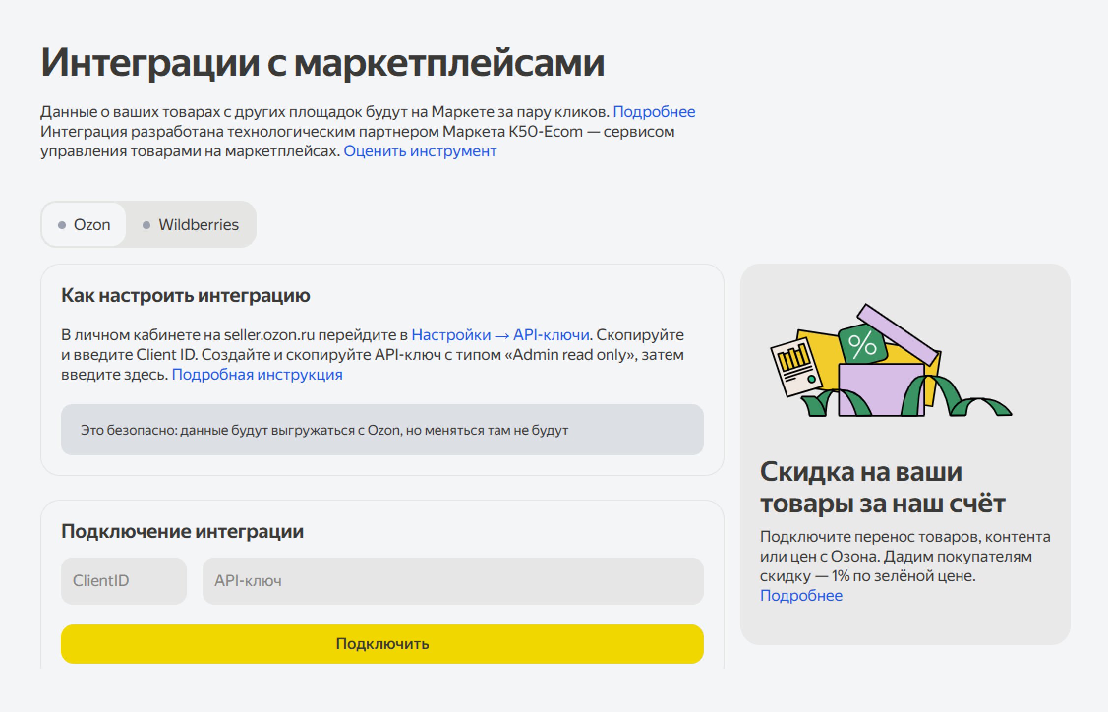 Если у вас уже есть магазин на Озон или Вайлдберриз, то вы можете скопировать свои товары оттуда. Для этого настройте интеграцию, и все характеристики, описания и визуальный контент появятся на Яндекс Маркете.