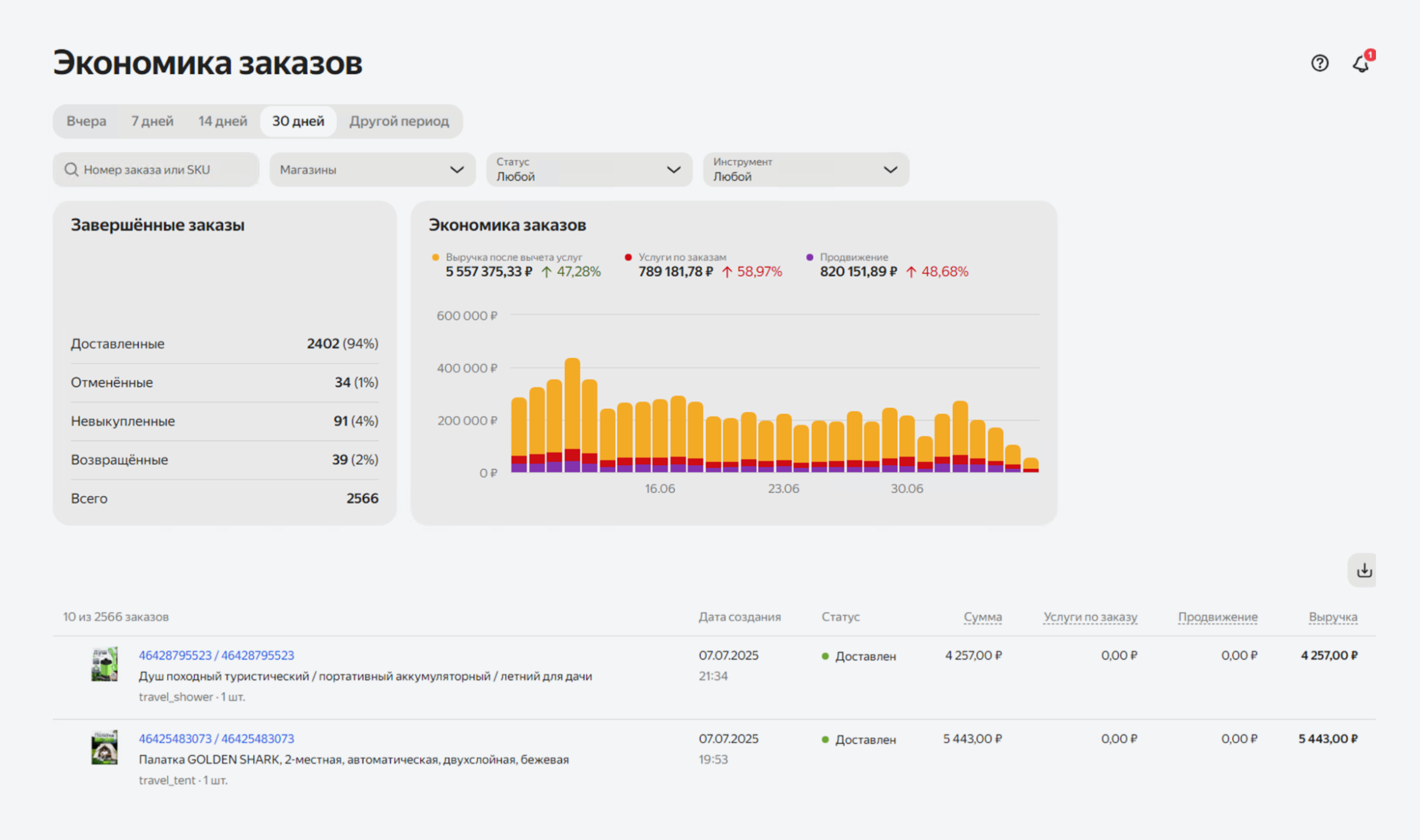 Все что касается заказов, продаж, возвратов и объеме выручки находится здесь. Данные представлены в виде наглядных графиков и таблиц, а период для отображения можно выбрать вручную.