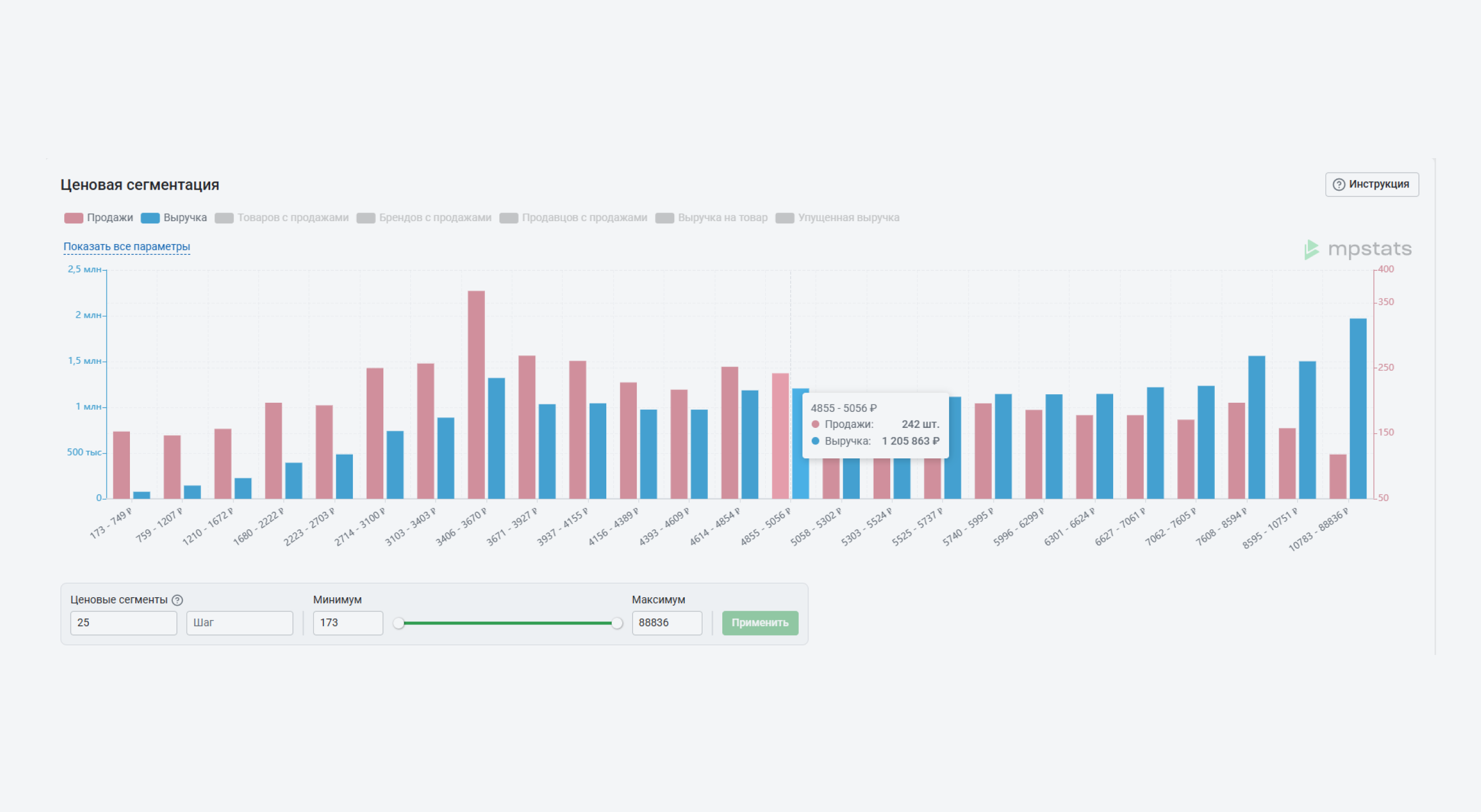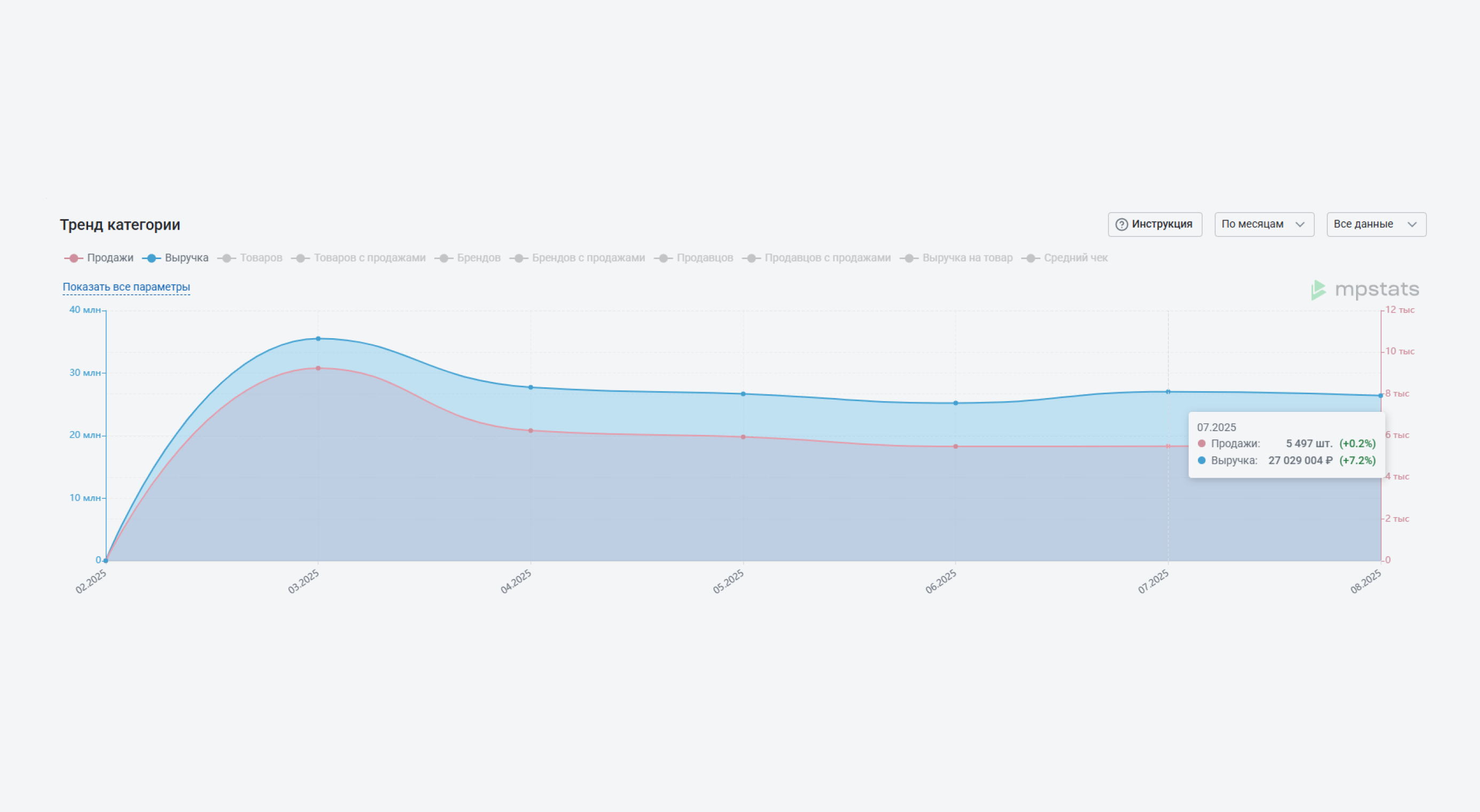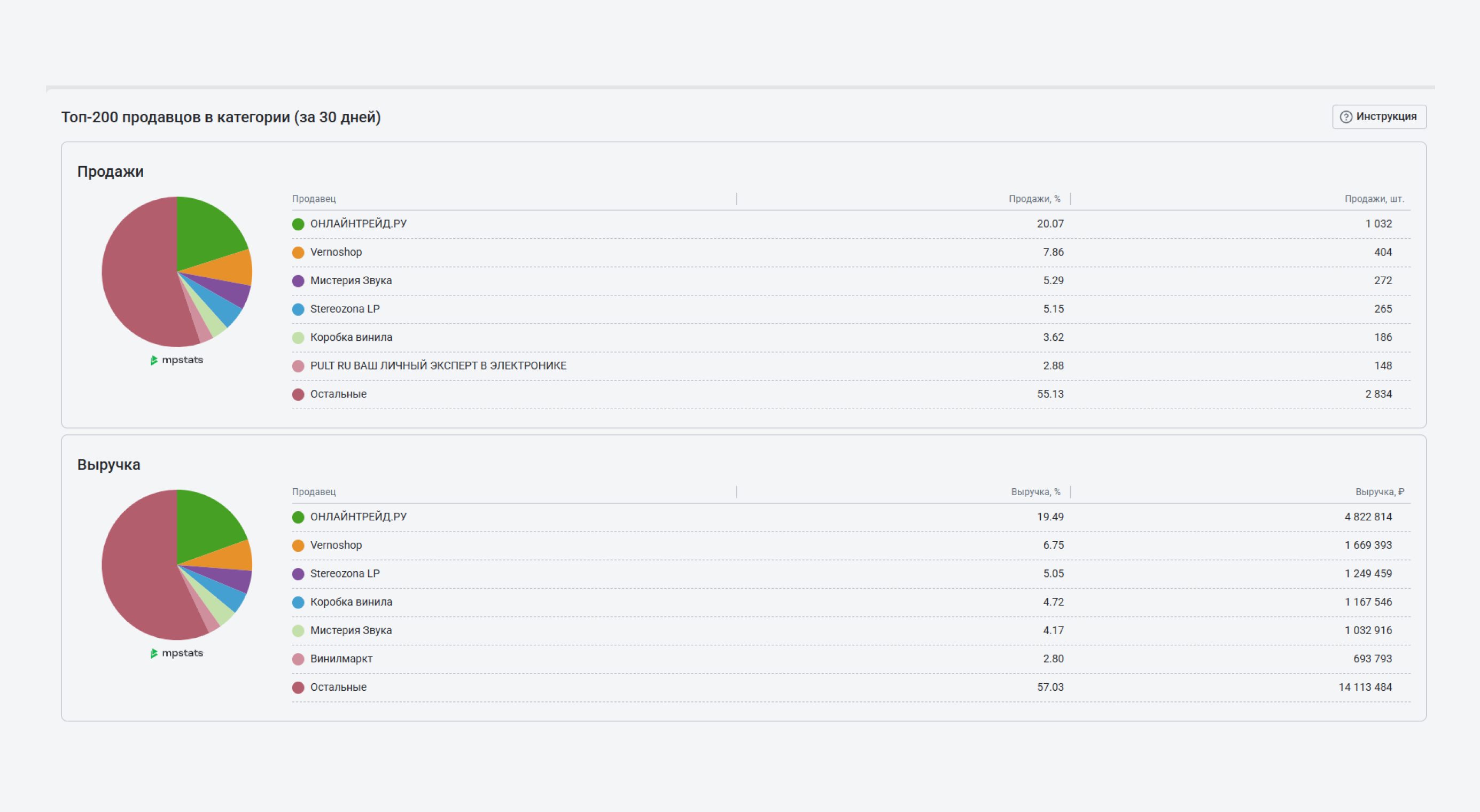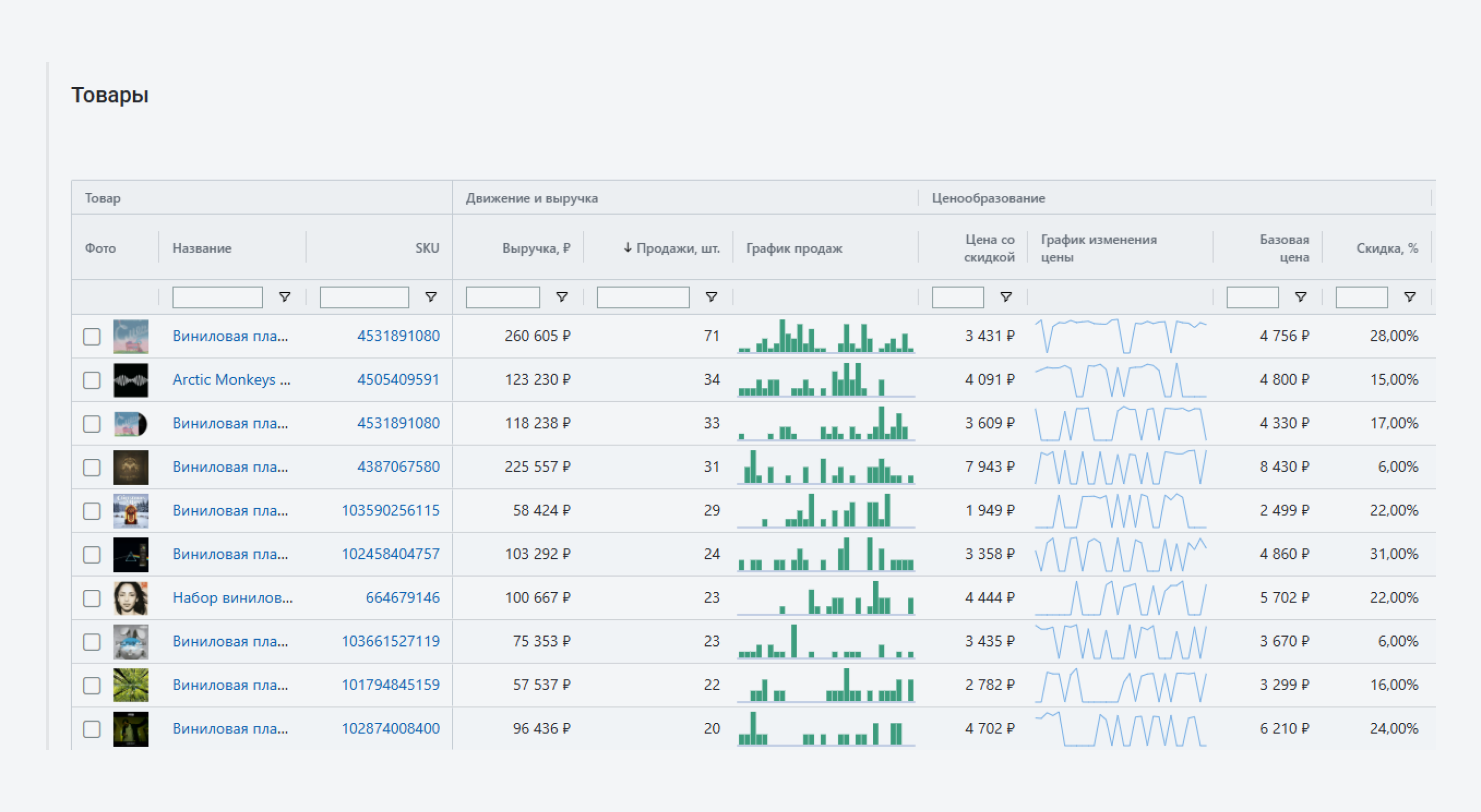 Поэтому здесь понадобятся сторонние сервисы: там можно просматривать основные показатели по категориям, продавцам, брендам или конкретным карточкам. Показываем примеры отчетов из модуля Аналитика Яндекс Маркет на нашей платформе, ниша «Виниловые пластинки»: