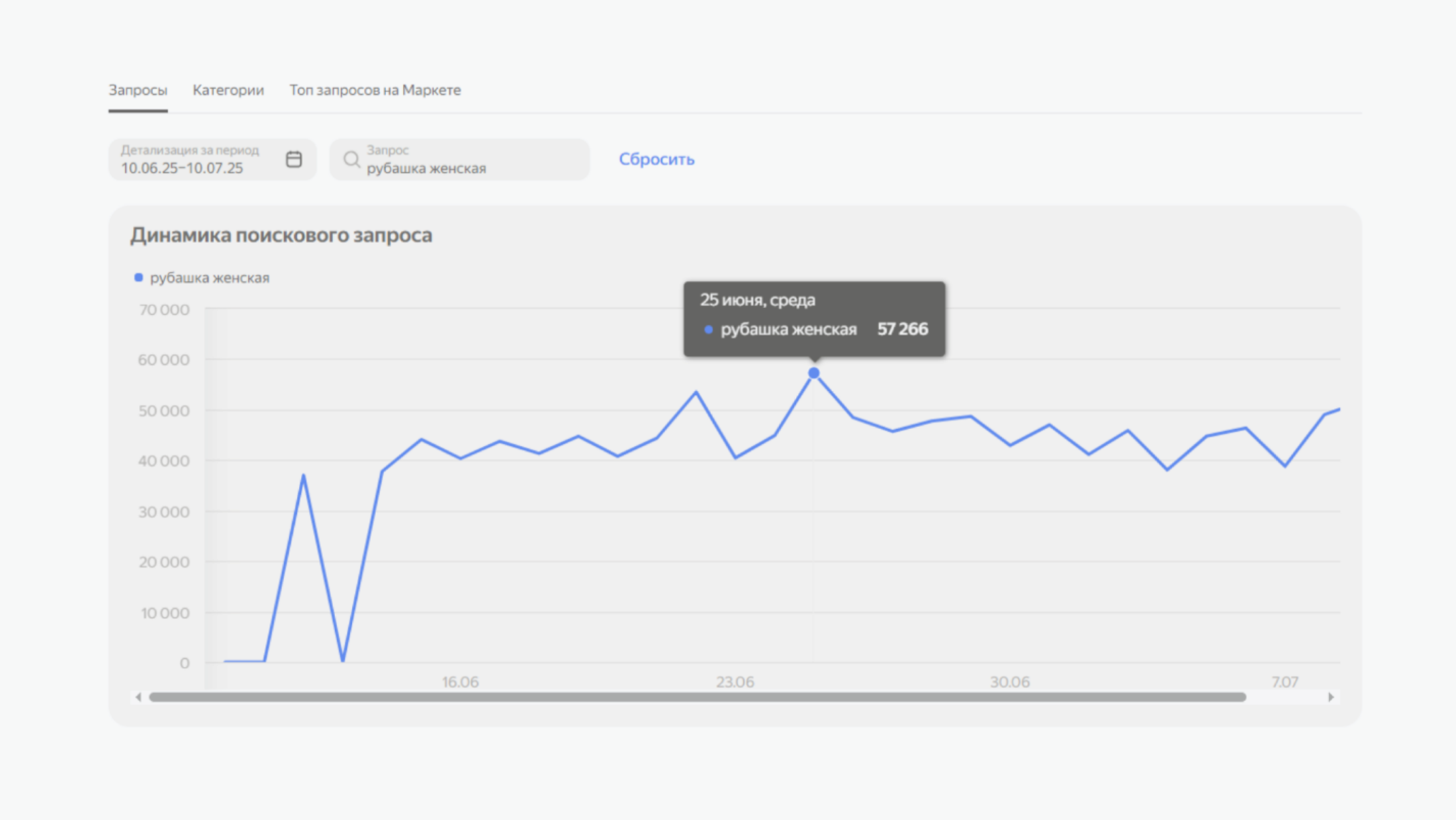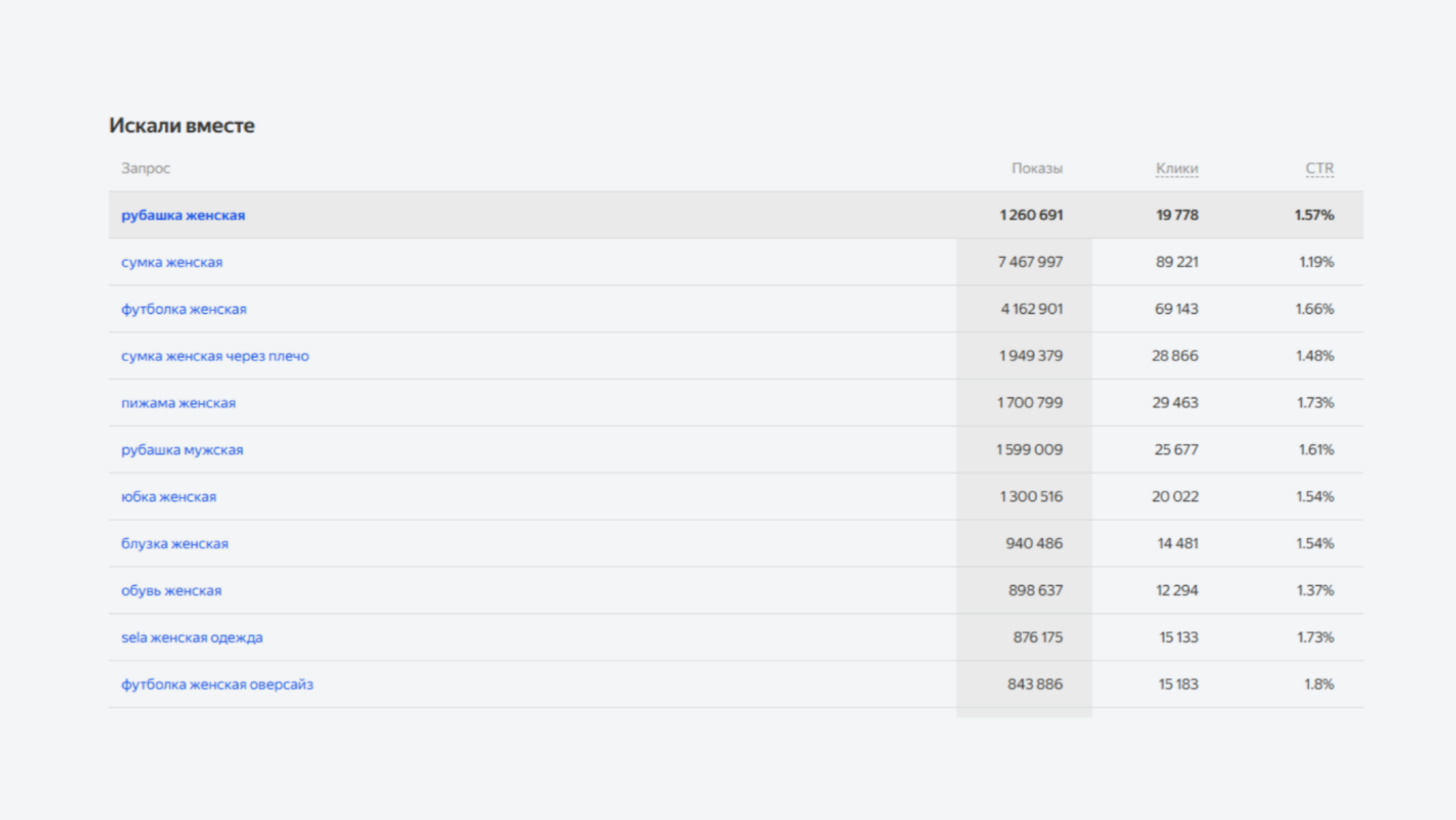 - Товары в поиске. Отображает список товаров, которые находятся в топе выдачи по вашему запросу. Вы сразу видите своих главных конкурентов и можете оценить их цены и предложения.