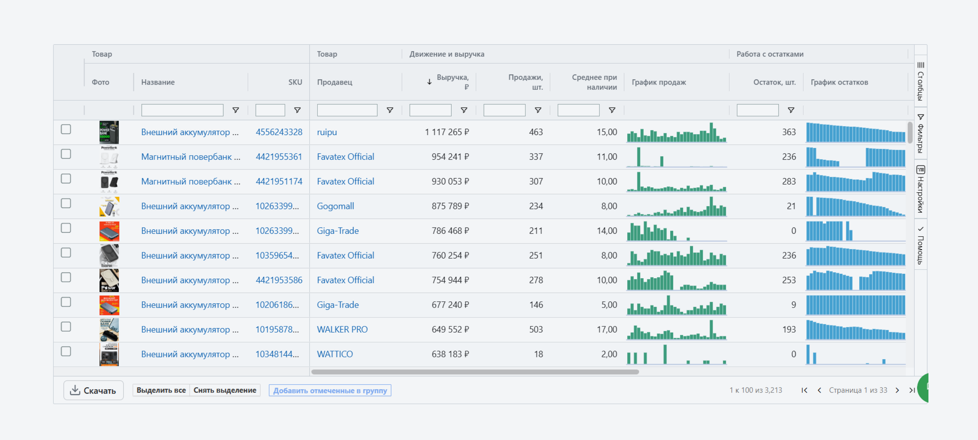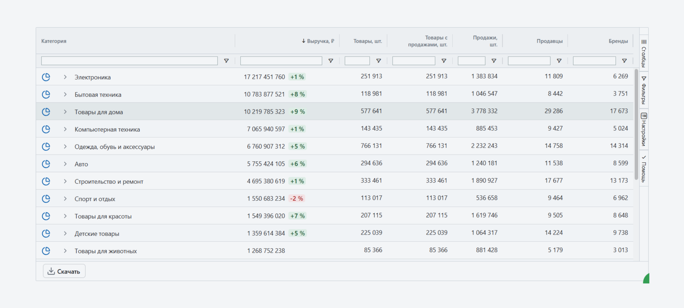 - статистика по категориям и товарам со всеми ключевыми метриками (продажи, выручка, цены и пр.)